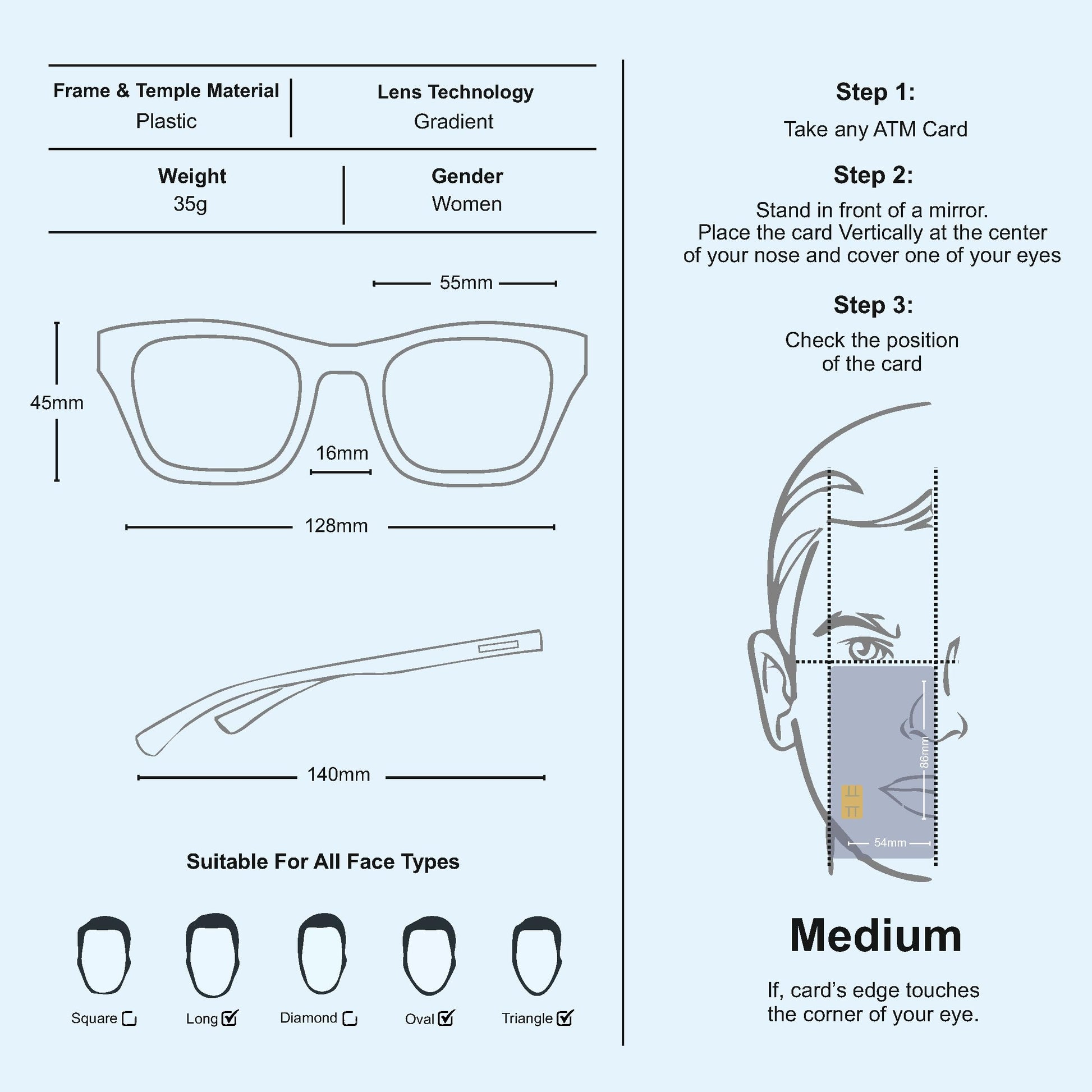 - Frame size: Lens width - 55 mm, nose-bridge: 16 mm, temple length: 140 mm