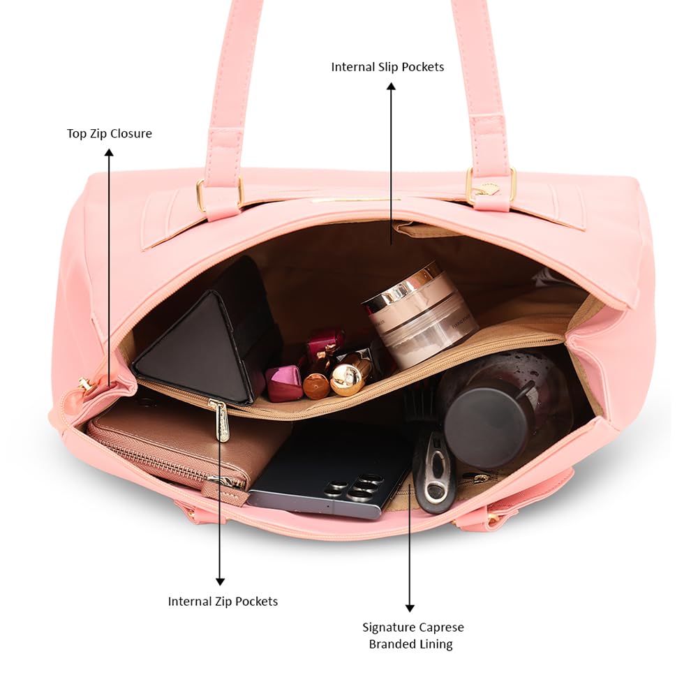 Super premium handfeel bag with ample space to carry essentials, 3 compartments with 1 internal zippered center divider compartment. Comfortable flat shoulder handles + adjustable & detachable sling handle with easy access back zipper pocket and secure top zip closure. Inspired by a pristine little island off the italian shores, caprese's world of fashion truly reflects the design language of its muse: the isle of capri. A country that has, for centuries, been synonymous with the future of women’s fashion, echoing with an unblemished, free spirit.