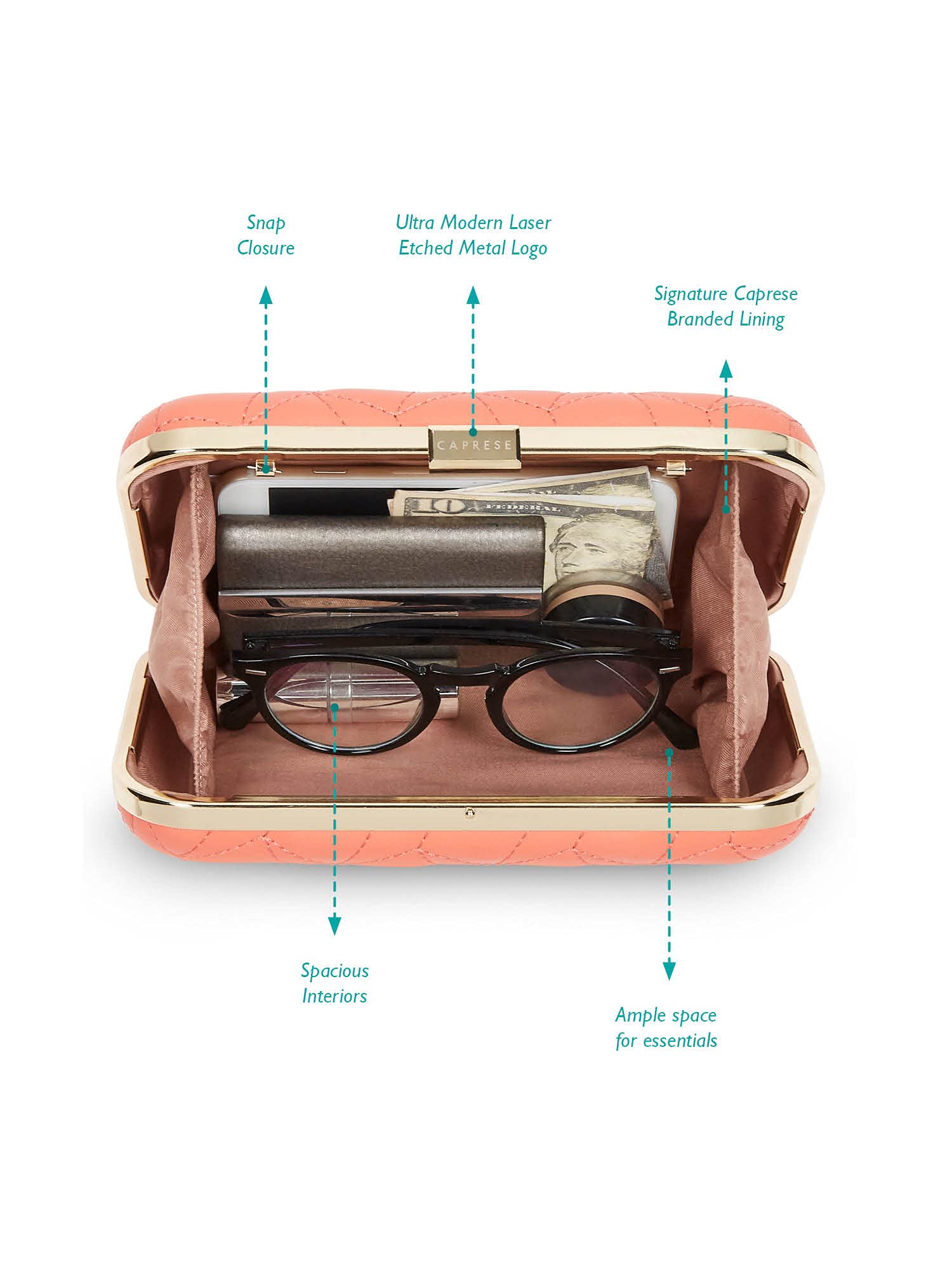 - Can be carried as a clutch and also as a sling with the adjustable detachable sling handle,Luxe quilted exterior,Snap Closure,Signature Caprese Branded Lining