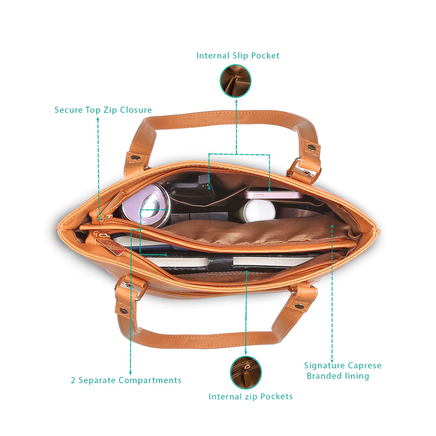3 compartments with 1 internal center divider compartment.Top Zip Closure.Organised interior with 1 internal zipper pocket + 2 internal slip pockets .Flat Handle
