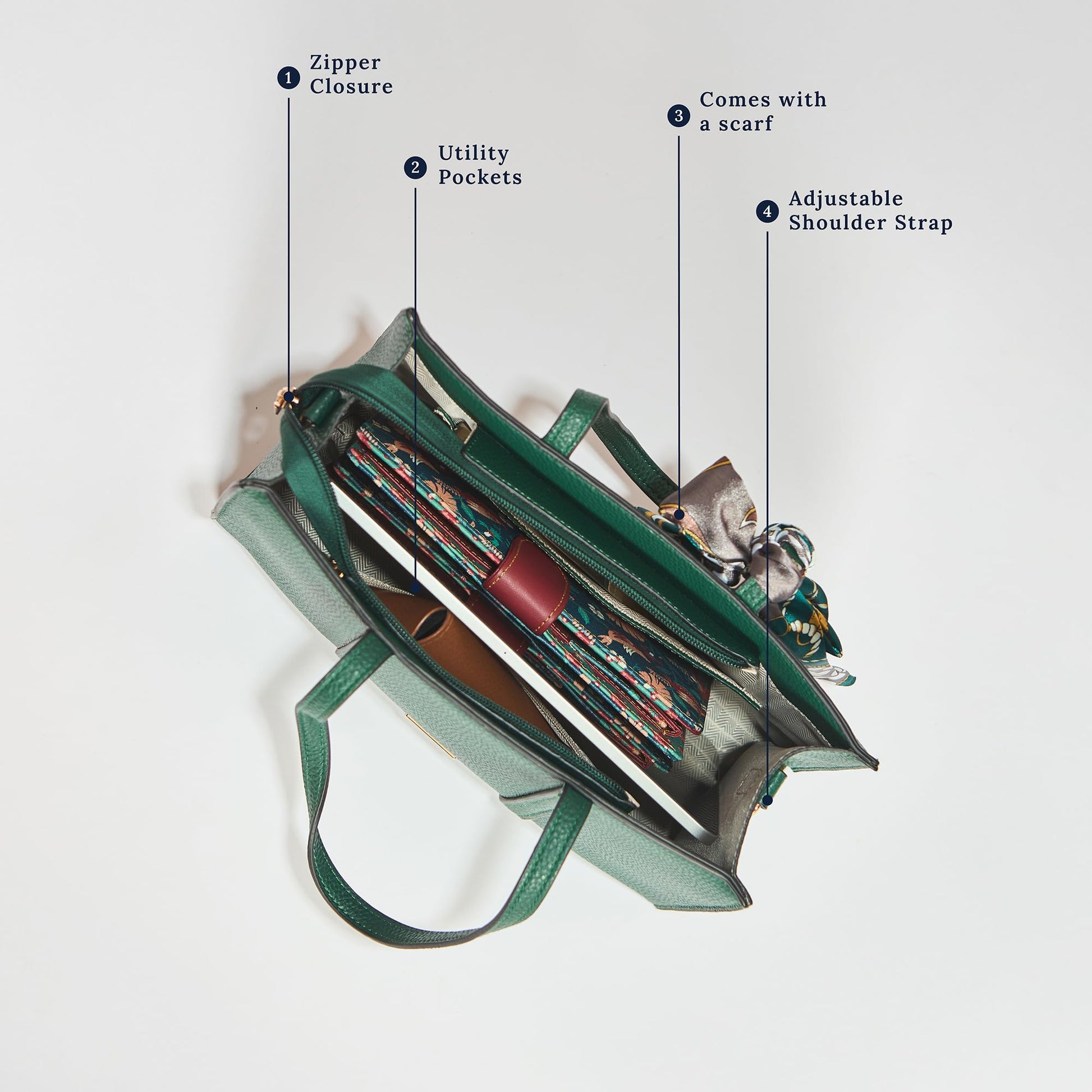 Chumbak Maldives Mini Tote with Scarf | Green | Multipurpose Hand Bag with Pouch for Shopping | Hand Held Bag for Women and Girls | Solid Colour Handbag