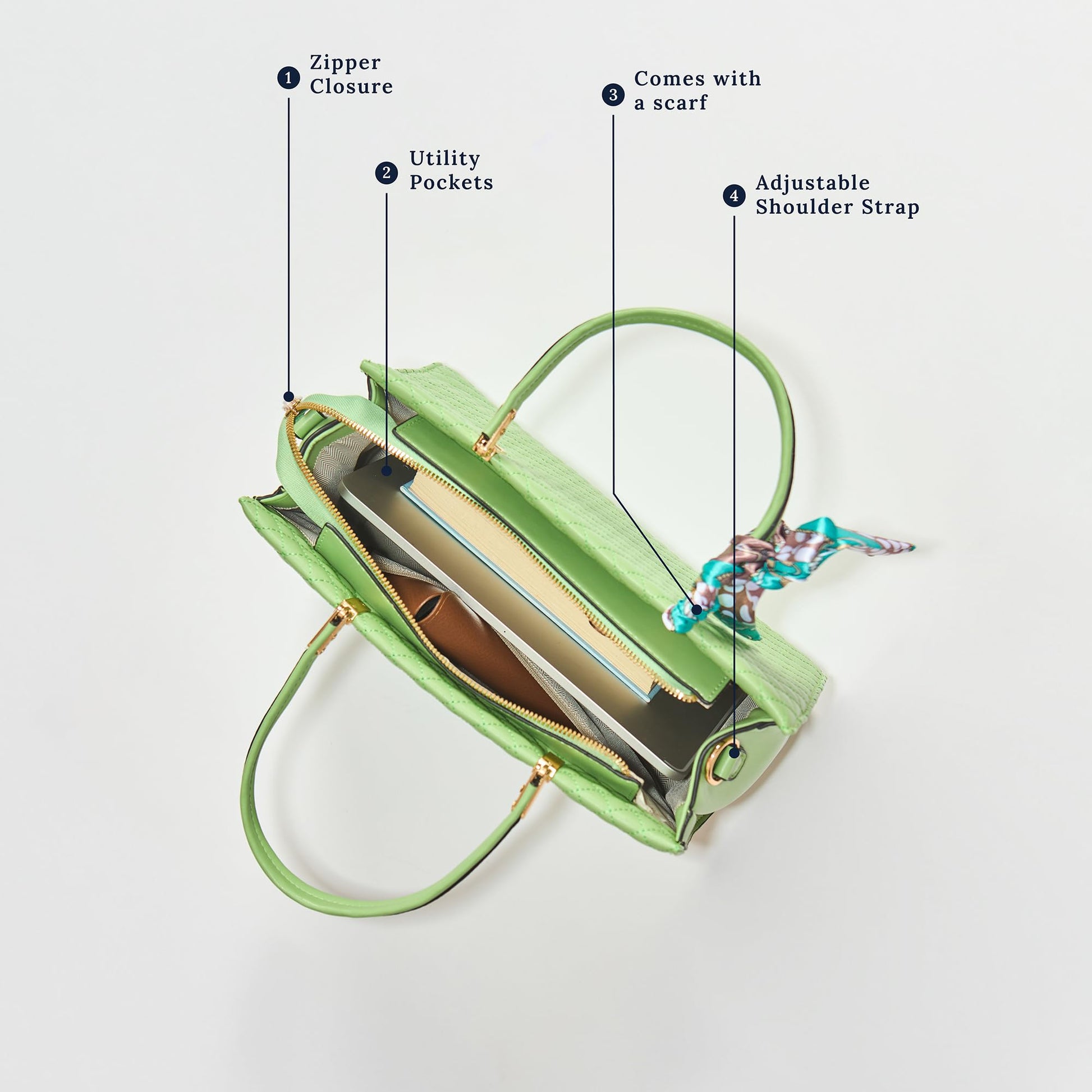 Chumbak Sage Quilted Handbag with Scarf, Sage Green, Multipurpose Hand Bag with Pouch for Shopping, Hand Held Bag for Women and Girls, Solid Colour Handbag