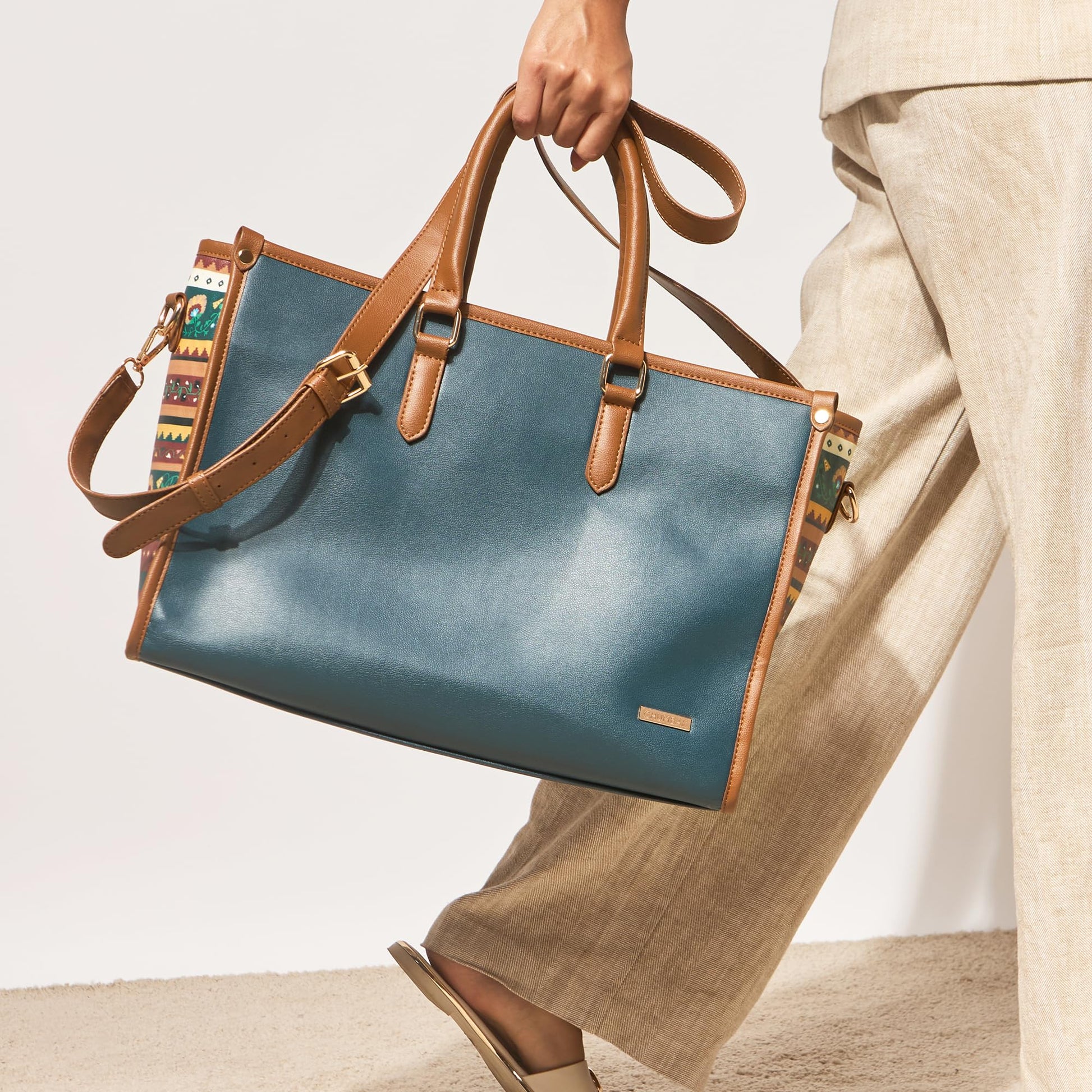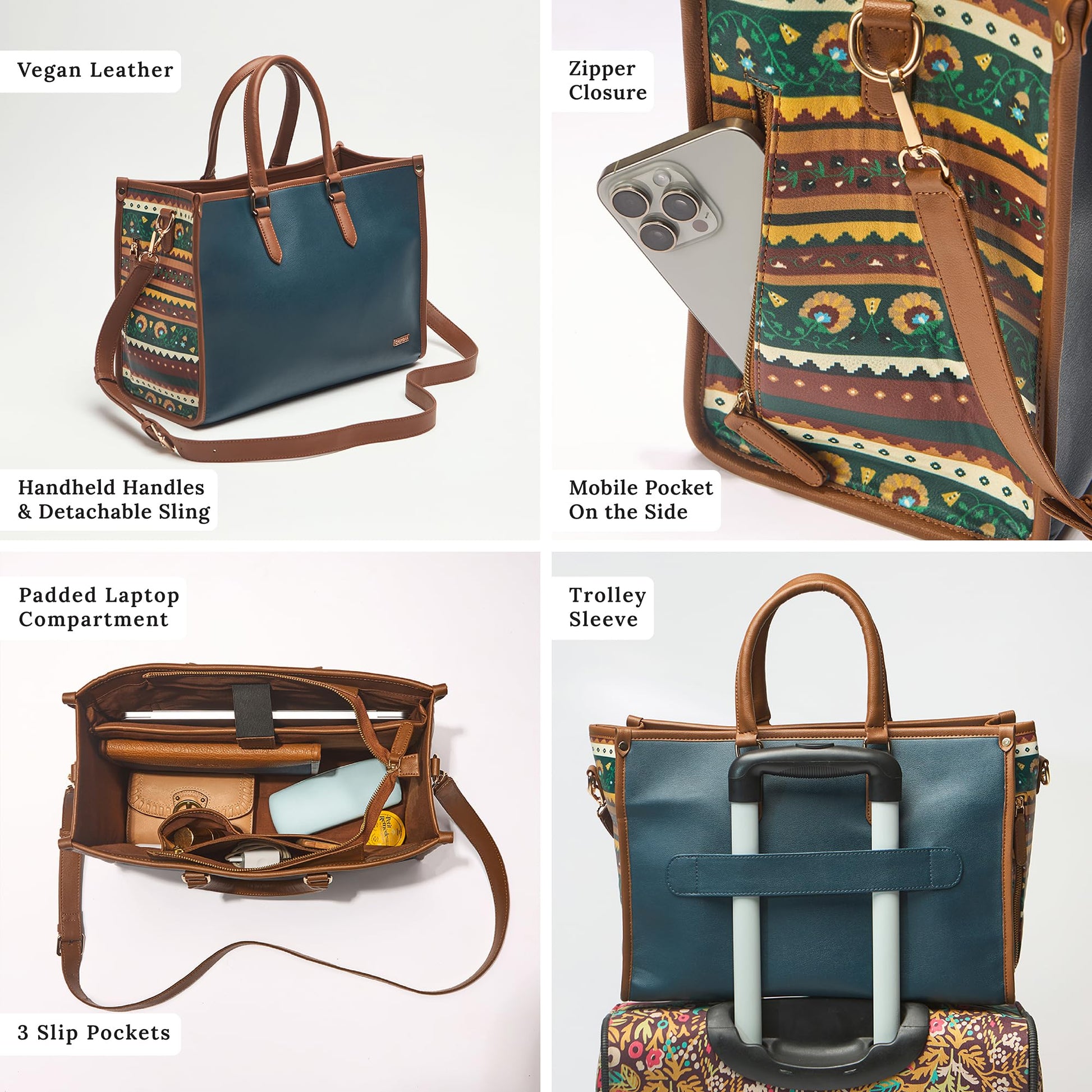 Chumbak Tulum Tote Bag for Women, Navy Floral PU Leather, Digital Nomad Collection, Stylish Travel-Friendly Zipper Tote, Durable and Spacious for Everyday Essentials