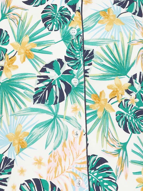 printed button down shirt & pyjama set crafted with butter-soft & comfortable crepe fabric. Shirt with full button placket and short sleeves. Matching pyjama with an elasticated waistband for a snug fit. Pockets on both sides.