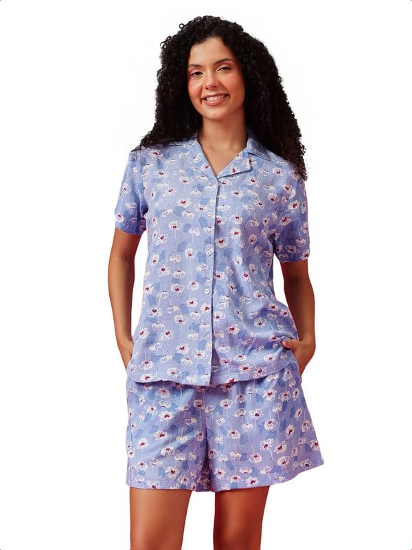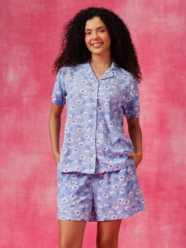 Clovia Women's Rayon Printed Button-Down Shirt & Shorts Set in Blue