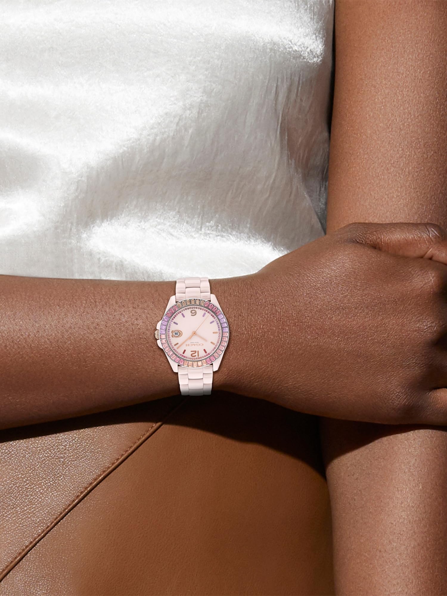 - Featuring a round dial and Quartz basic movement, this exquisite timepiece ensures precise timekeeping. The durable mineral crystal offers lasting protection, making it both practical and stylish. Elevate your everyday look with the timeless sophistication of the Coach Greyson watch.