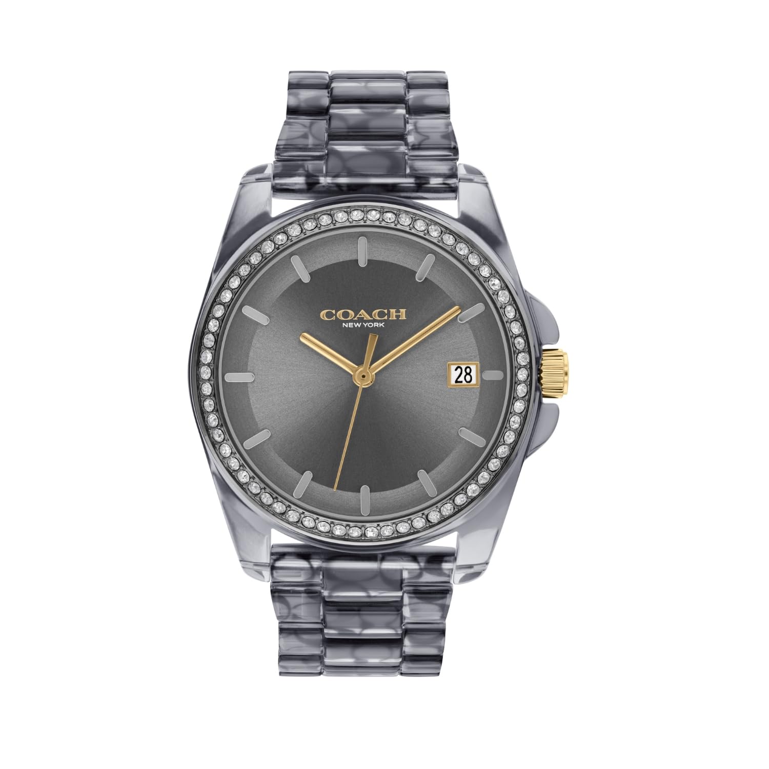 - Featuring a round dial and Quartz basic movement, this exquisite timepiece ensures precise timekeeping. The durable mineral crystal offers lasting protection, making it both practical and stylish. Elevate your everyday look with the timeless sophistication of the Coach Greyson watch.