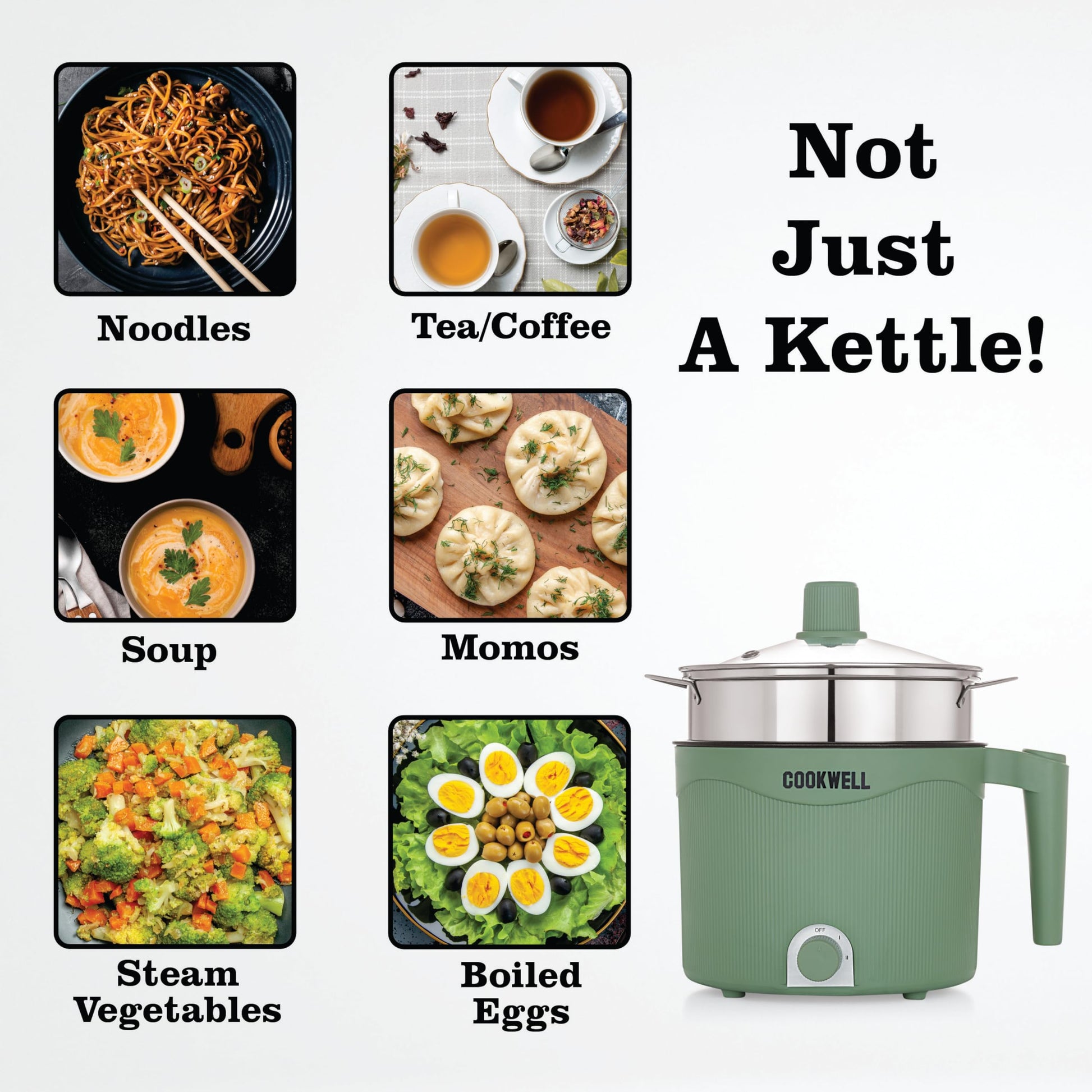 Cookwell Multipurpose Electric Kettle - 1.5L Nonstick Inner Pot with Steamer, Idlli Stand, Stainless Steel Rack & Egg Rack (600W)