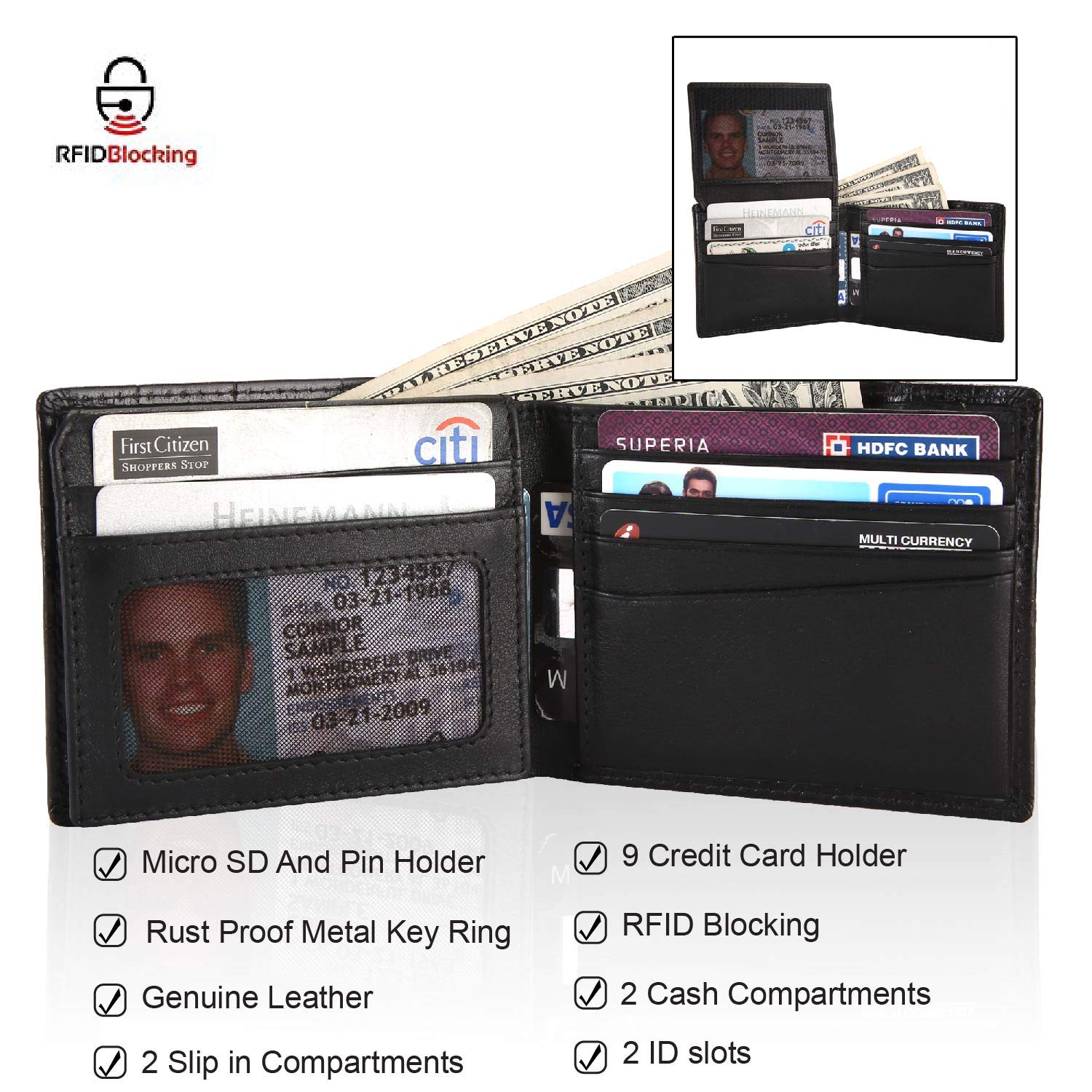 - Product features: Rid protected, 9 credit card slots, 2 inside multi- utility slip-in pockets, 2 id window, 2 large currency compartments, 1 key holder loop, sd card or microsd holder, pin holder. Material : genuine leather. Dimensions : length- 11 cm ; breadth- 9.2 cm.