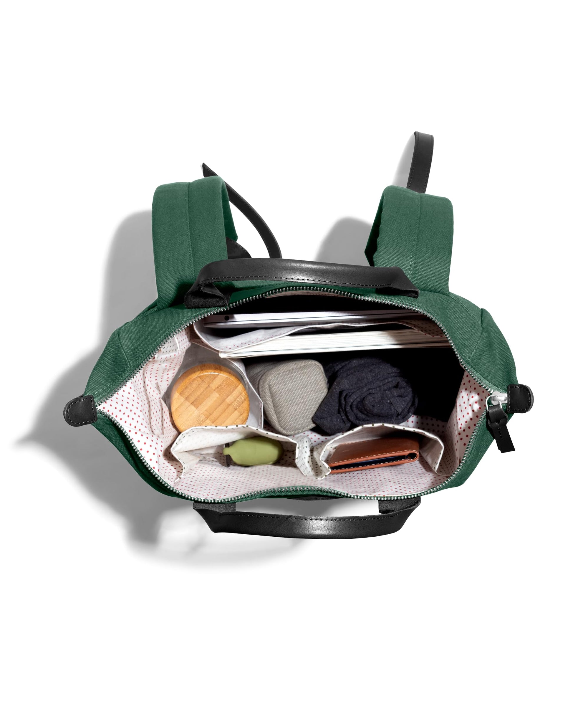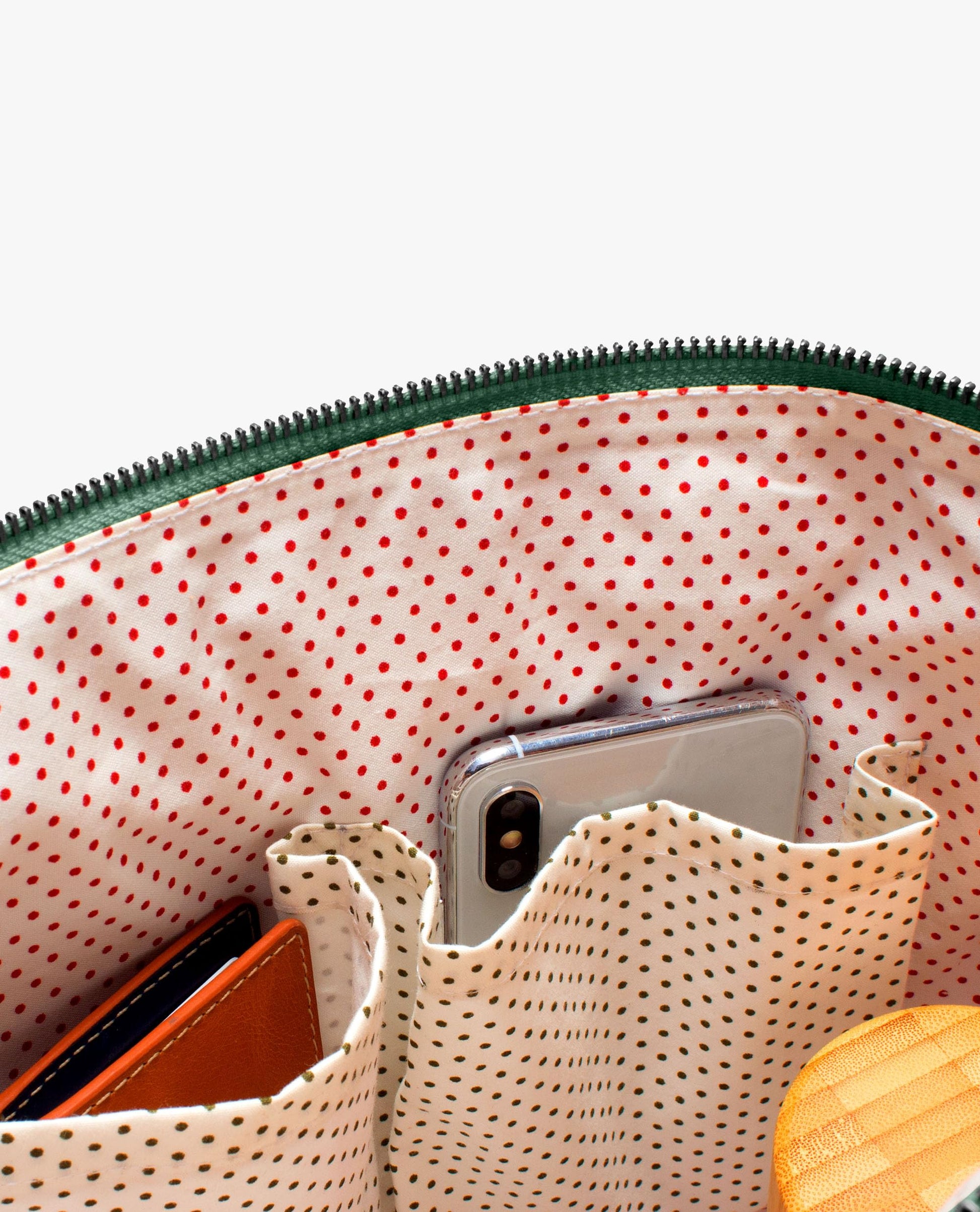 - Wholly cotton inner lining with select prints. Internal zip pocket and two slip pockets for small storage. External back pocket with full length slide facet. Classic leather branding. Metal zippers with seamless leather pull and snap hook keychain holder.