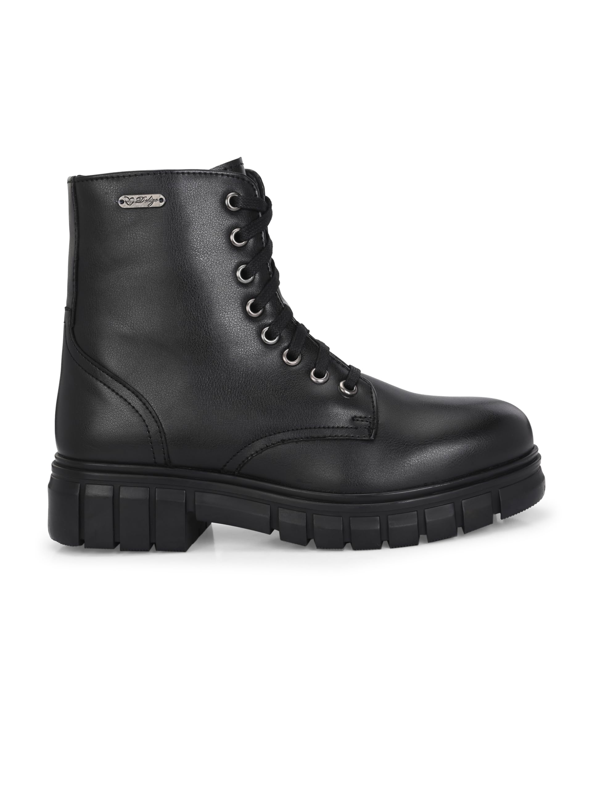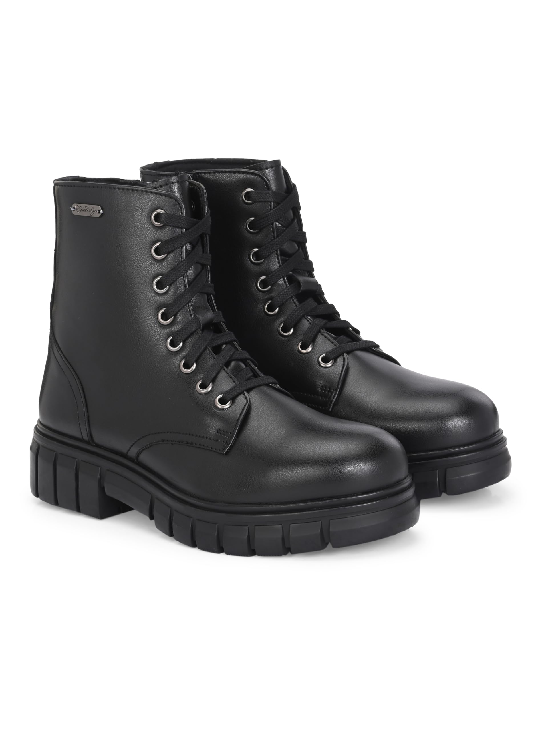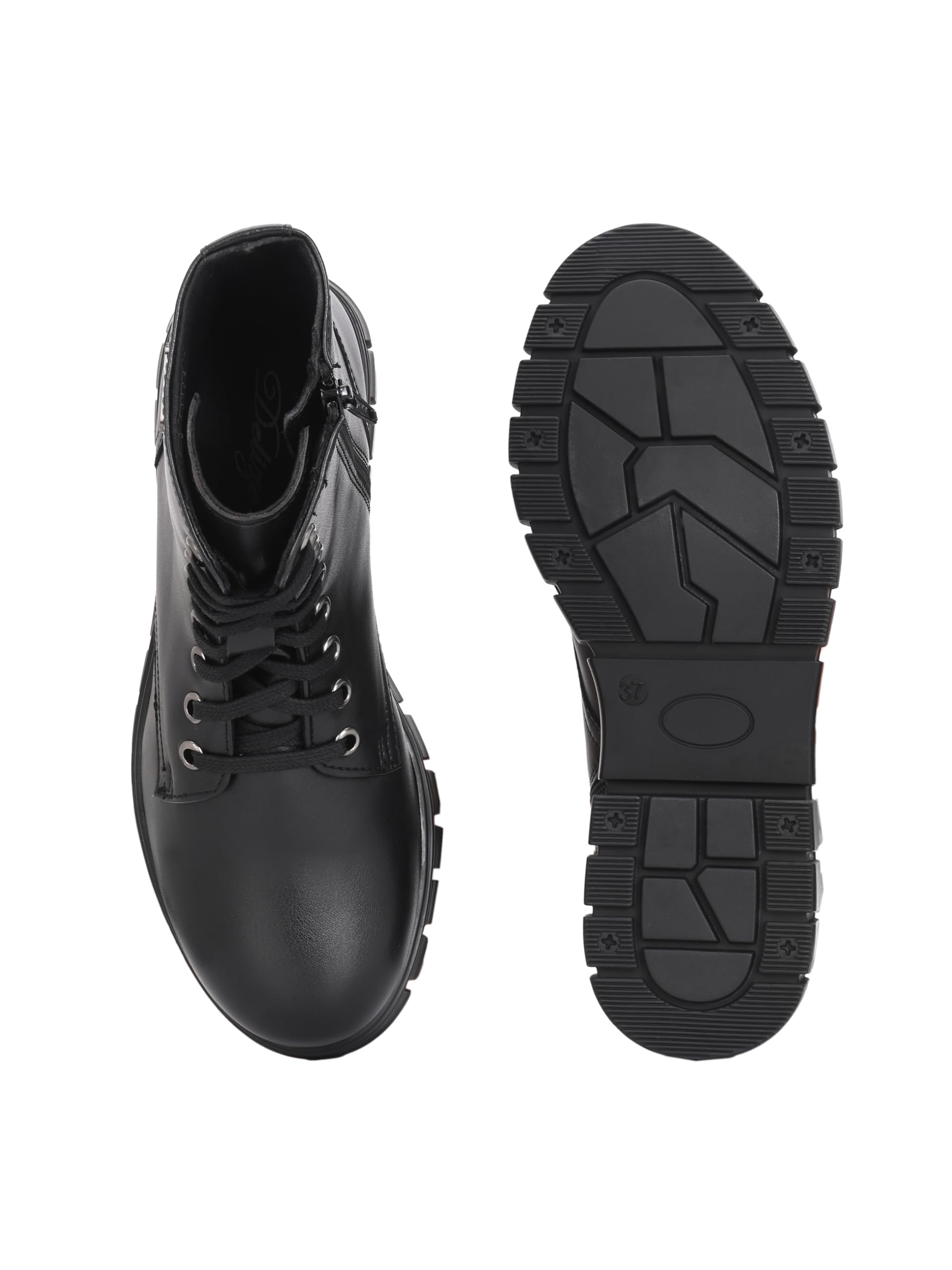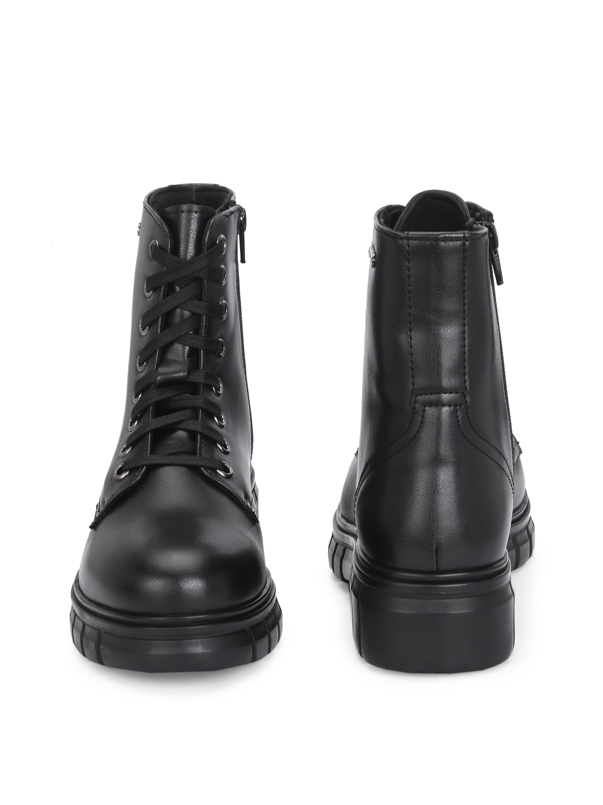 Black women vegan leather, derby ankle boots with track outsole. Has inside zip to wear easily. Eight eyelets facing Fabric lining and memory foam insock for ultimate comfort.