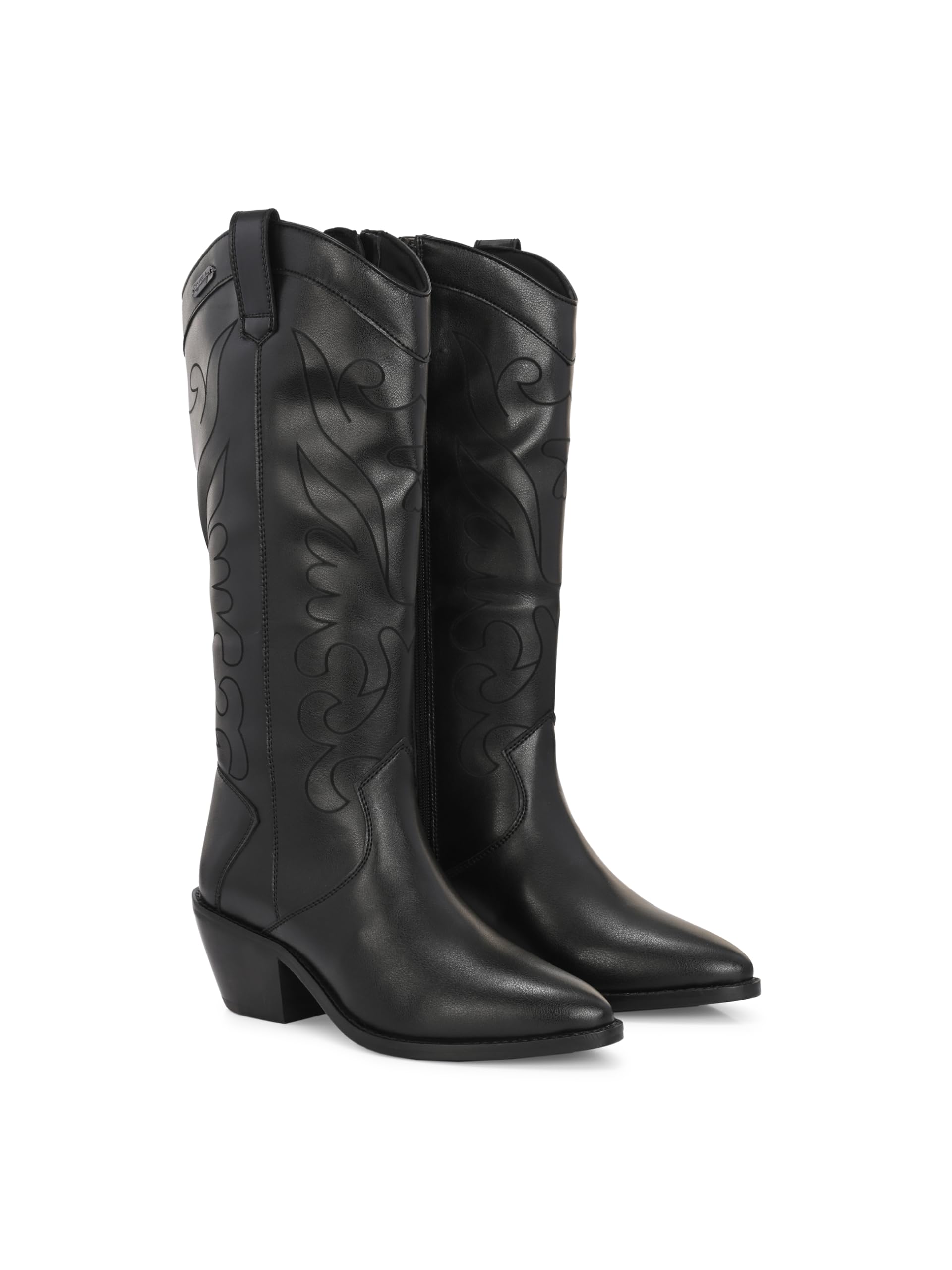 Black women, vegan leather, handmade outsole, mid heel, western knee high boots with laser print detail. Has inside zip to wear easily. Fabric lining and memory foam insock for ultimate comfort.
