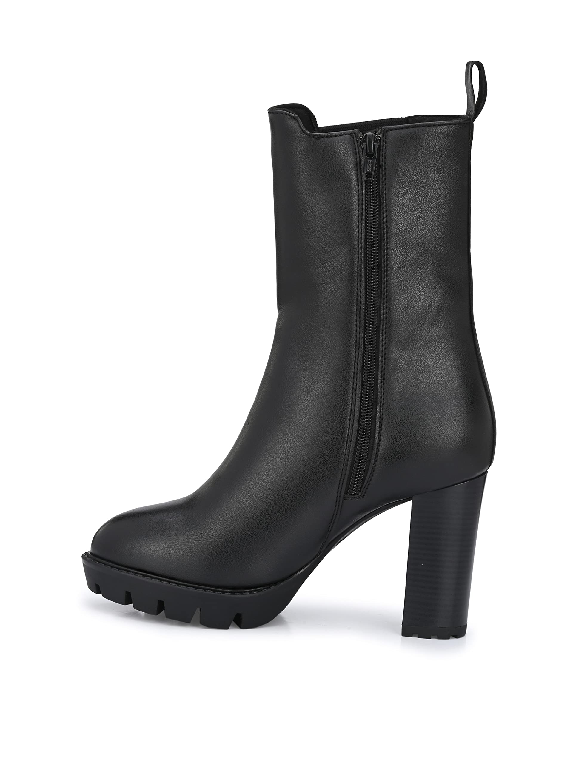 Black women vegan leather, calf length, high heel chelsea boots with outside elastic and inside zip to wear easily. Fabric lining and memory foam insock for ultimate comfort.