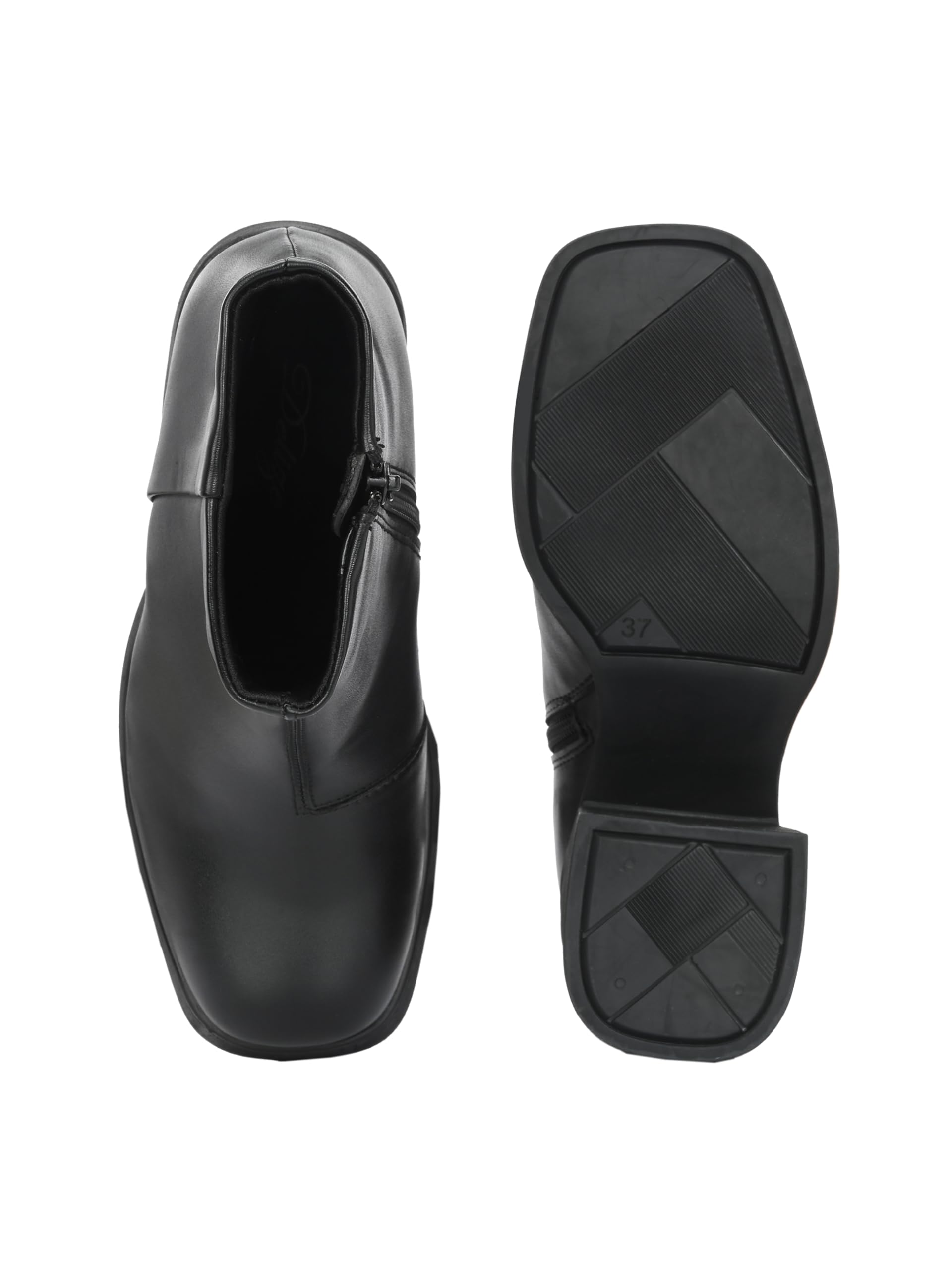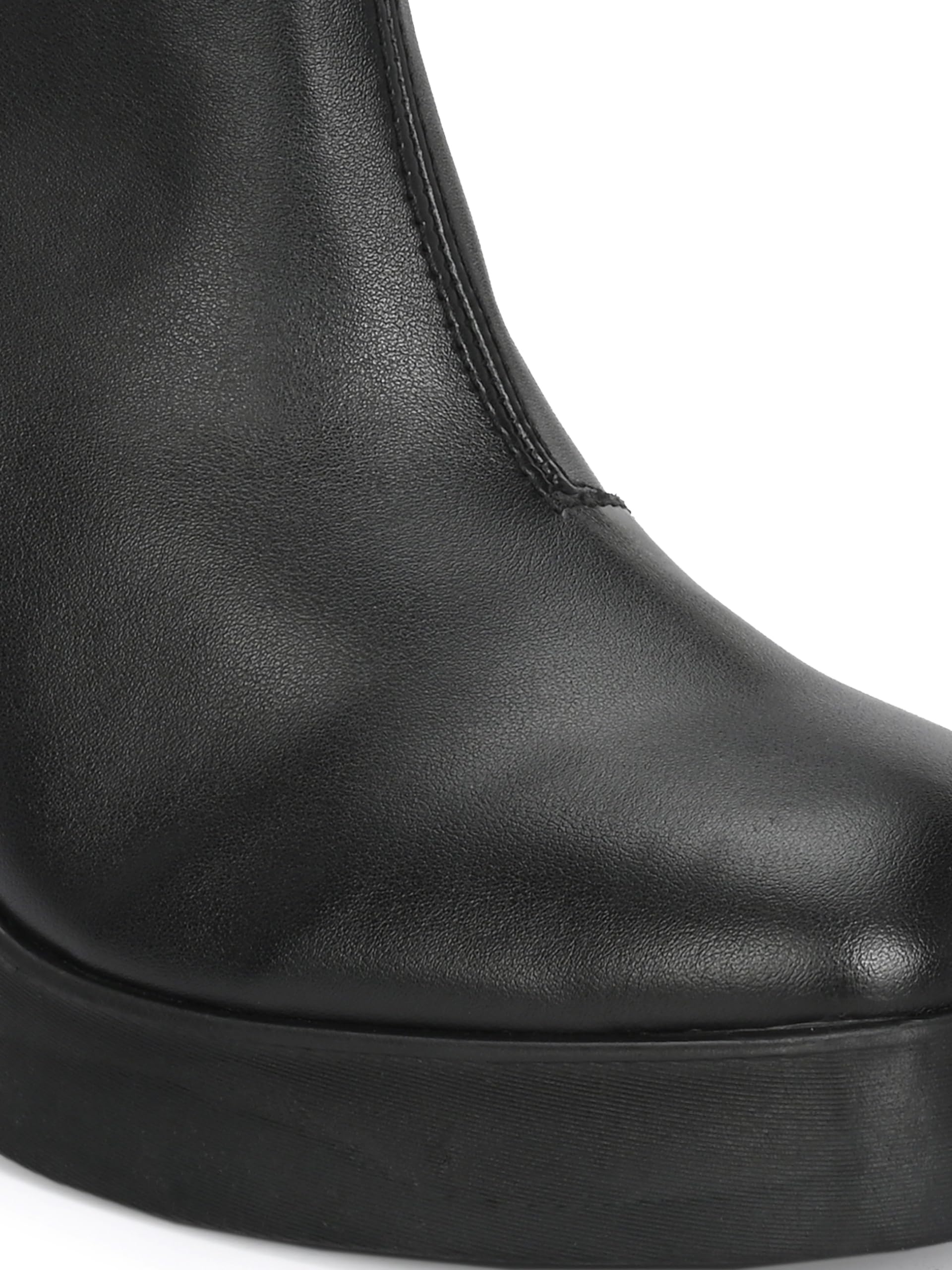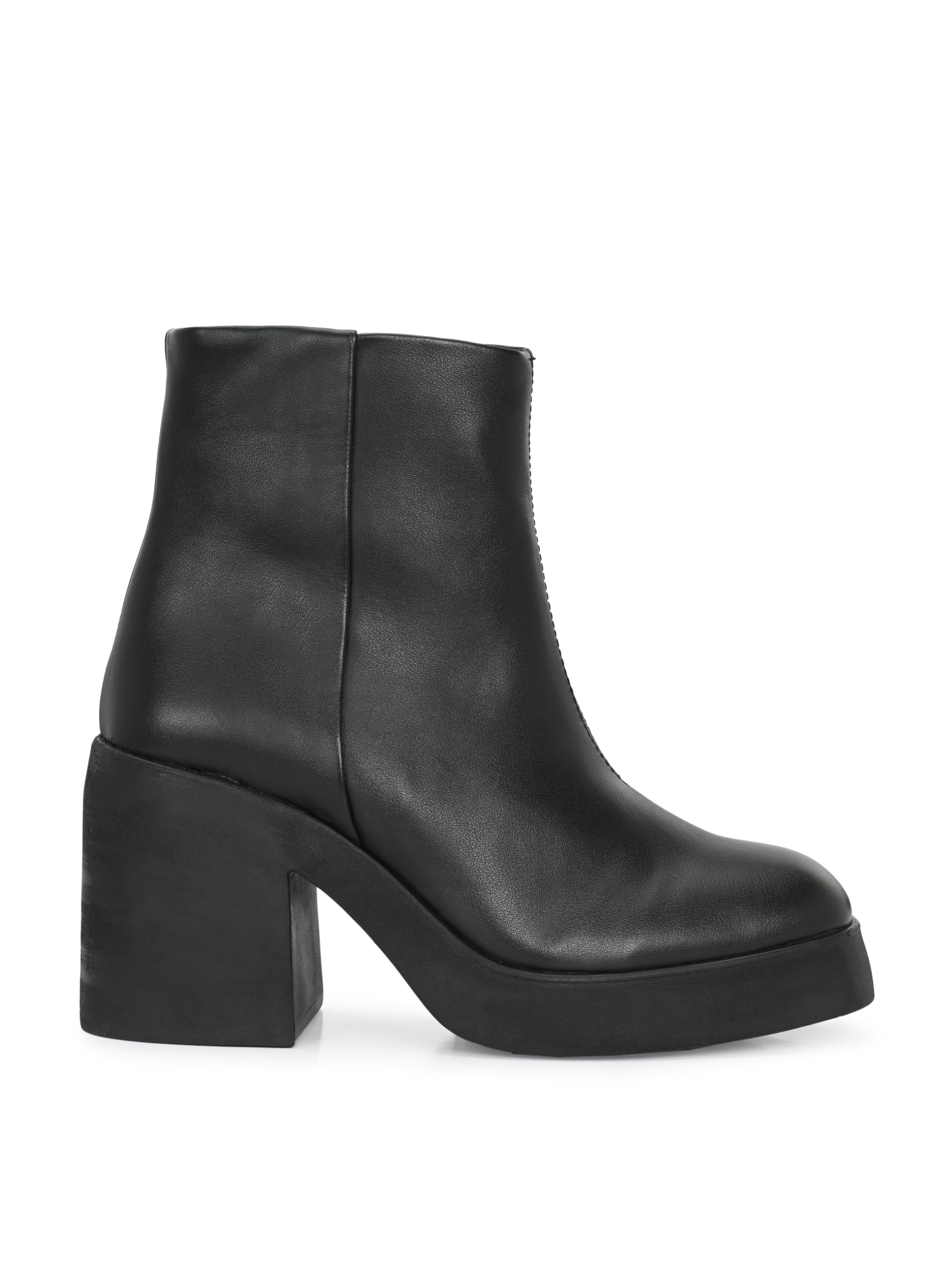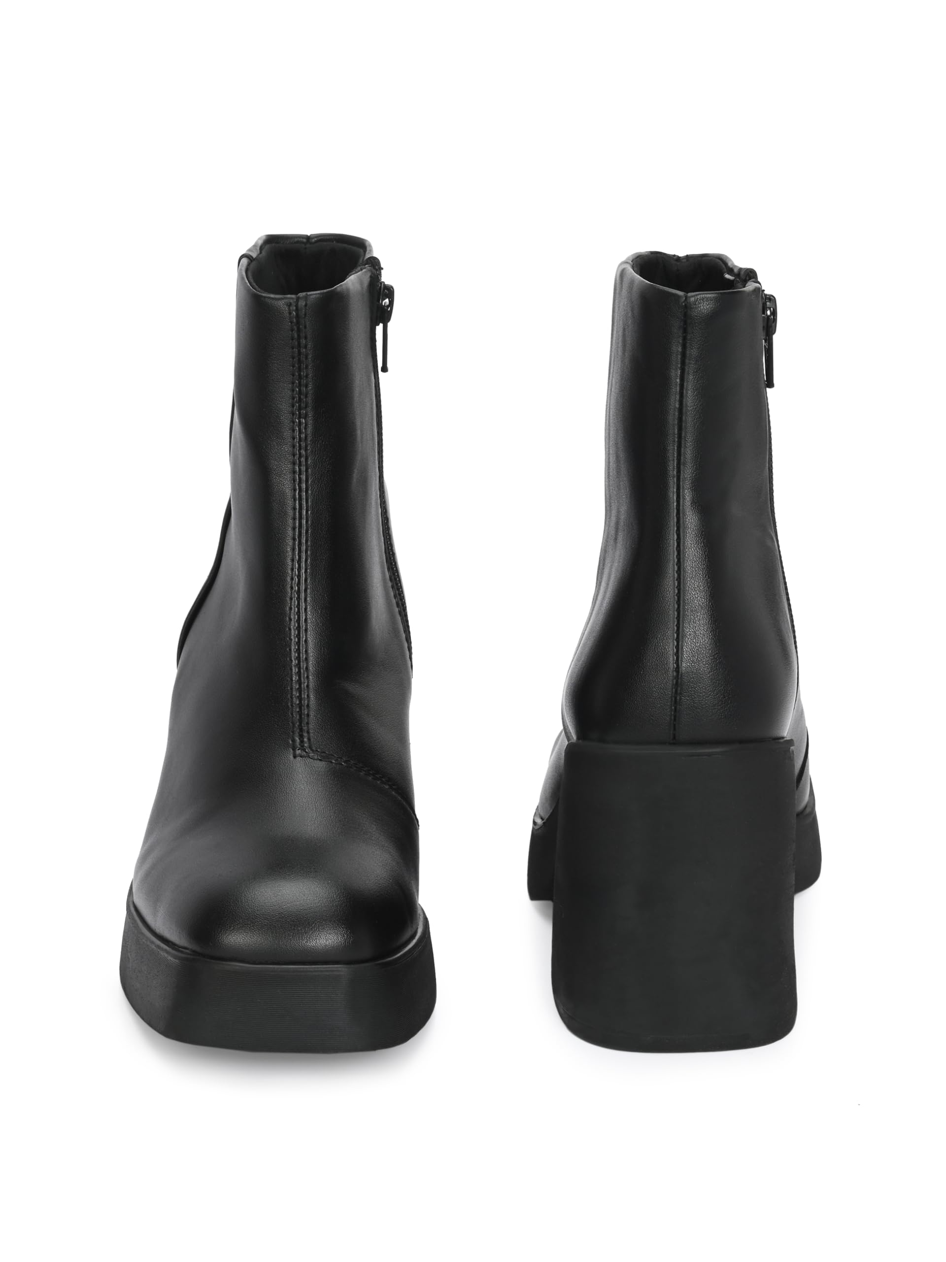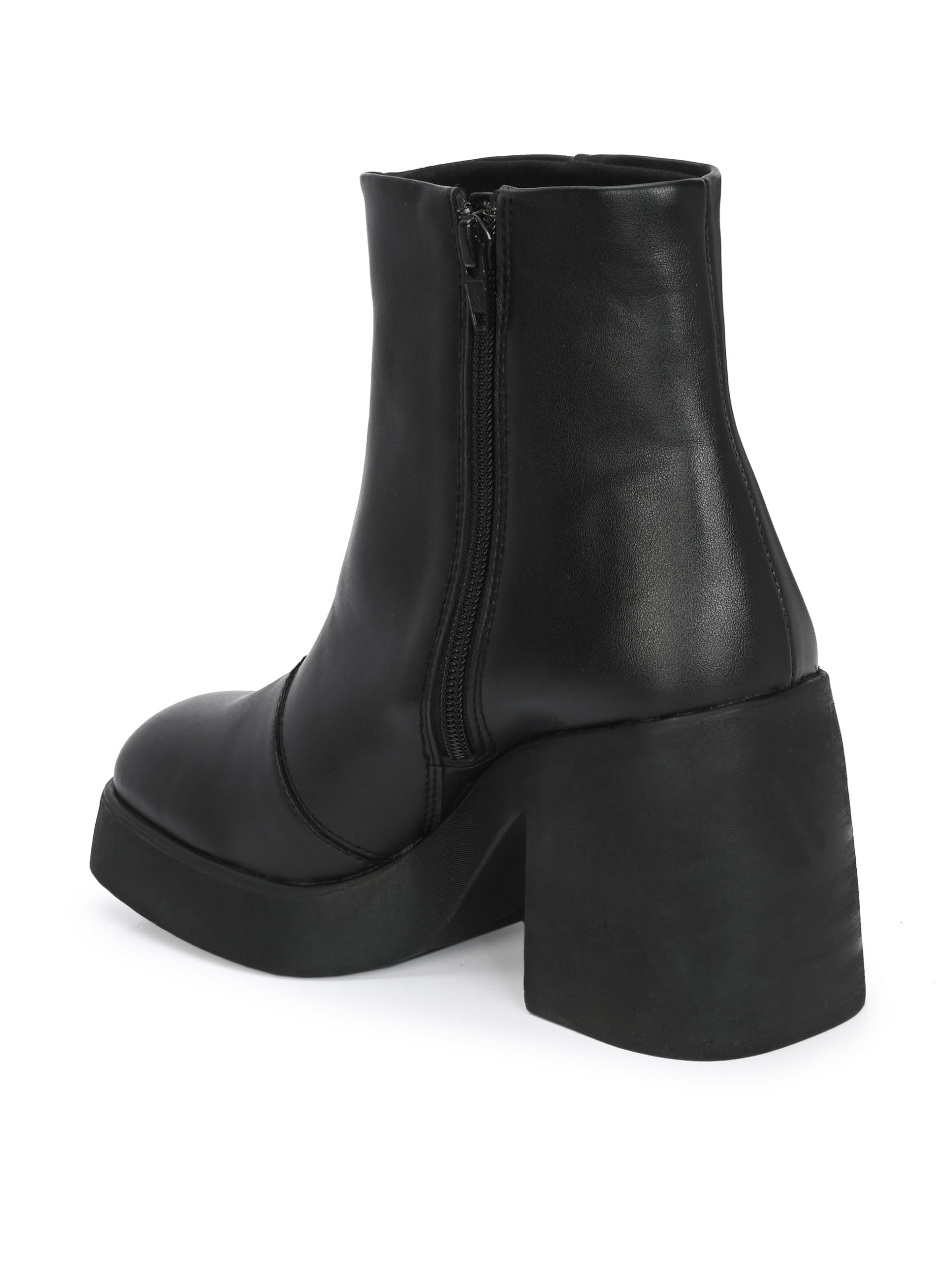 women vegan leather heeled boots with platform outsole. Has back loop detail and inside zip to wear easily. Fabric lining and memory foam insock for ultimate comfort.Heel height- front platform 0.8 inches Heel 3.5 inches