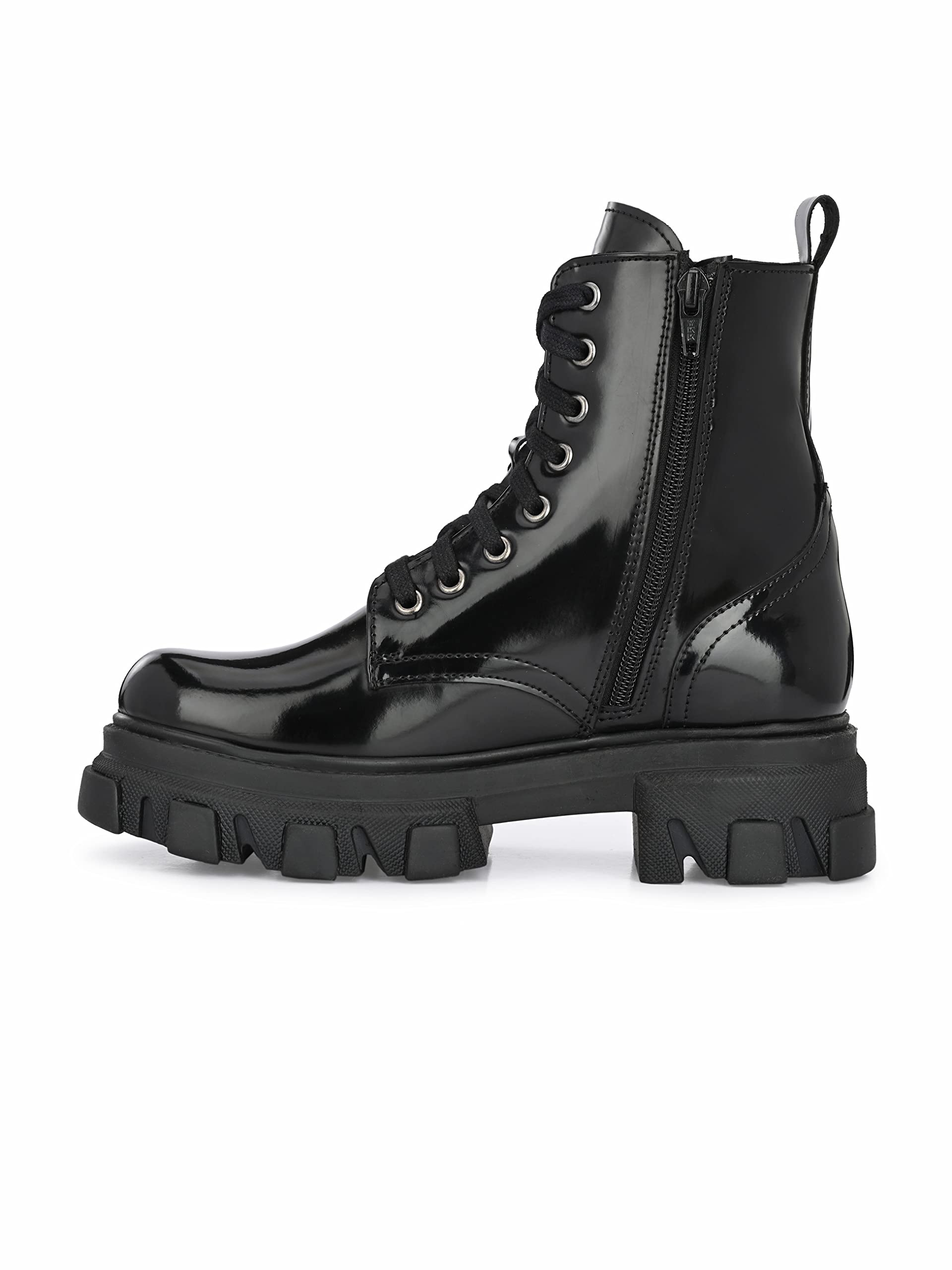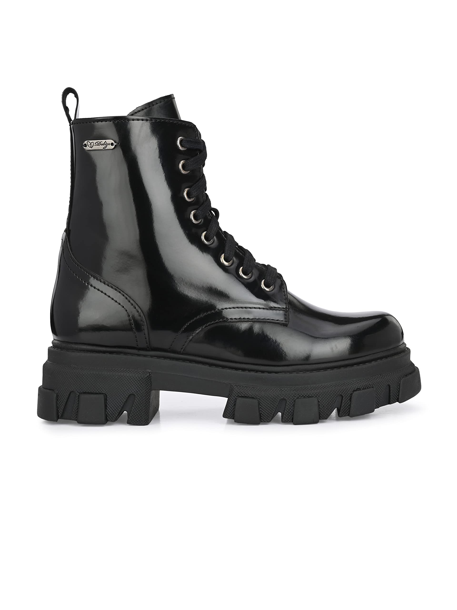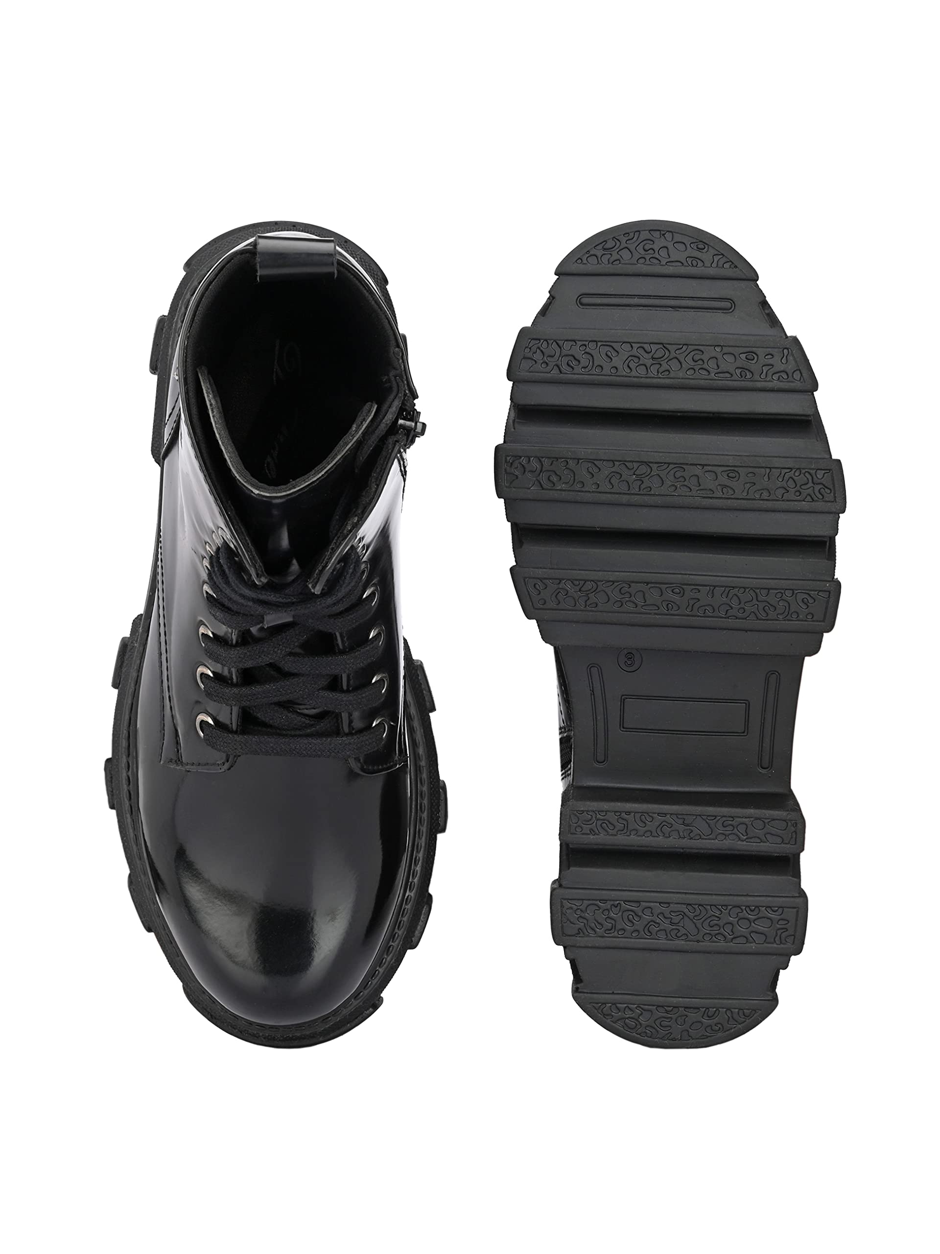 Black women vegan brush off leather women derby ankle boots with track outsole and back loop detail. Eight eyelets facing. Fabric lining and memory foam insock for ultimate comfort.