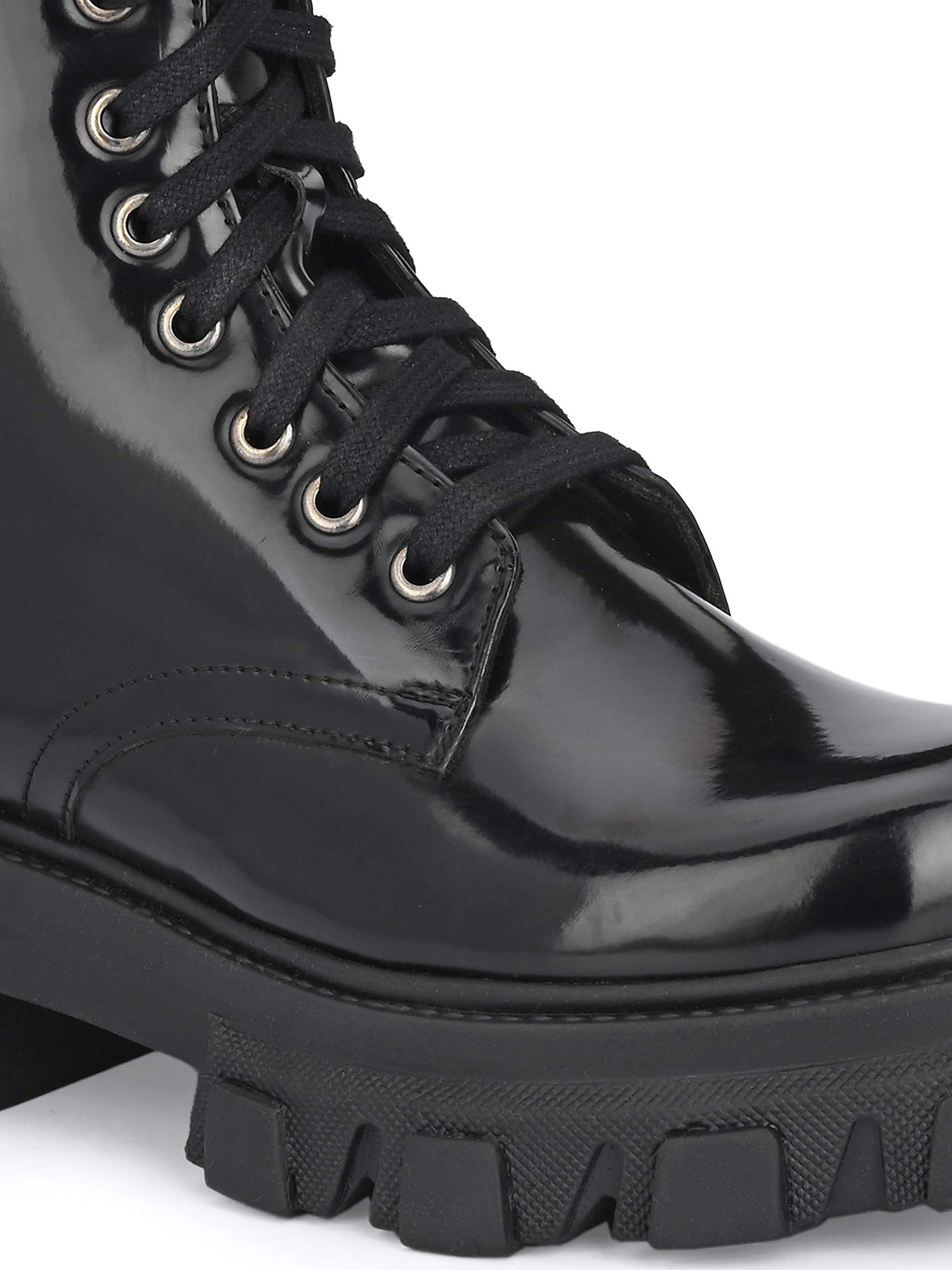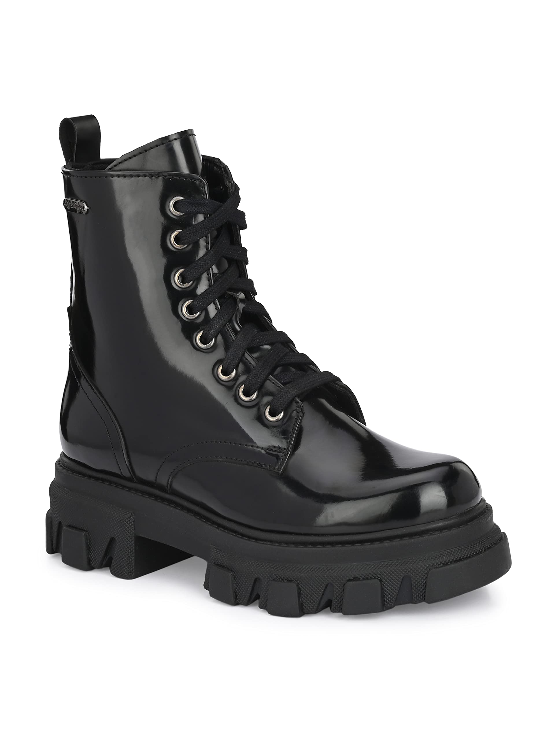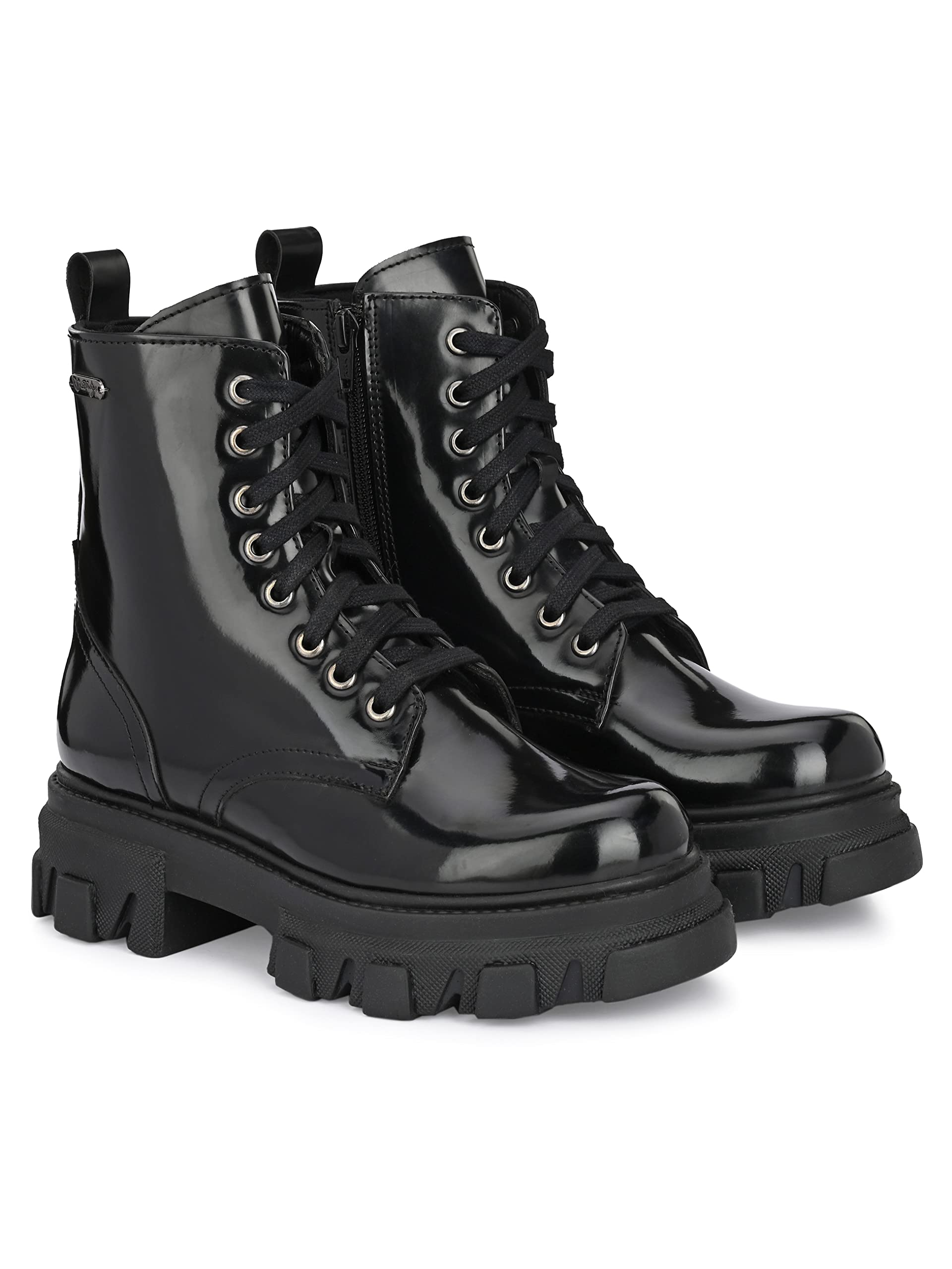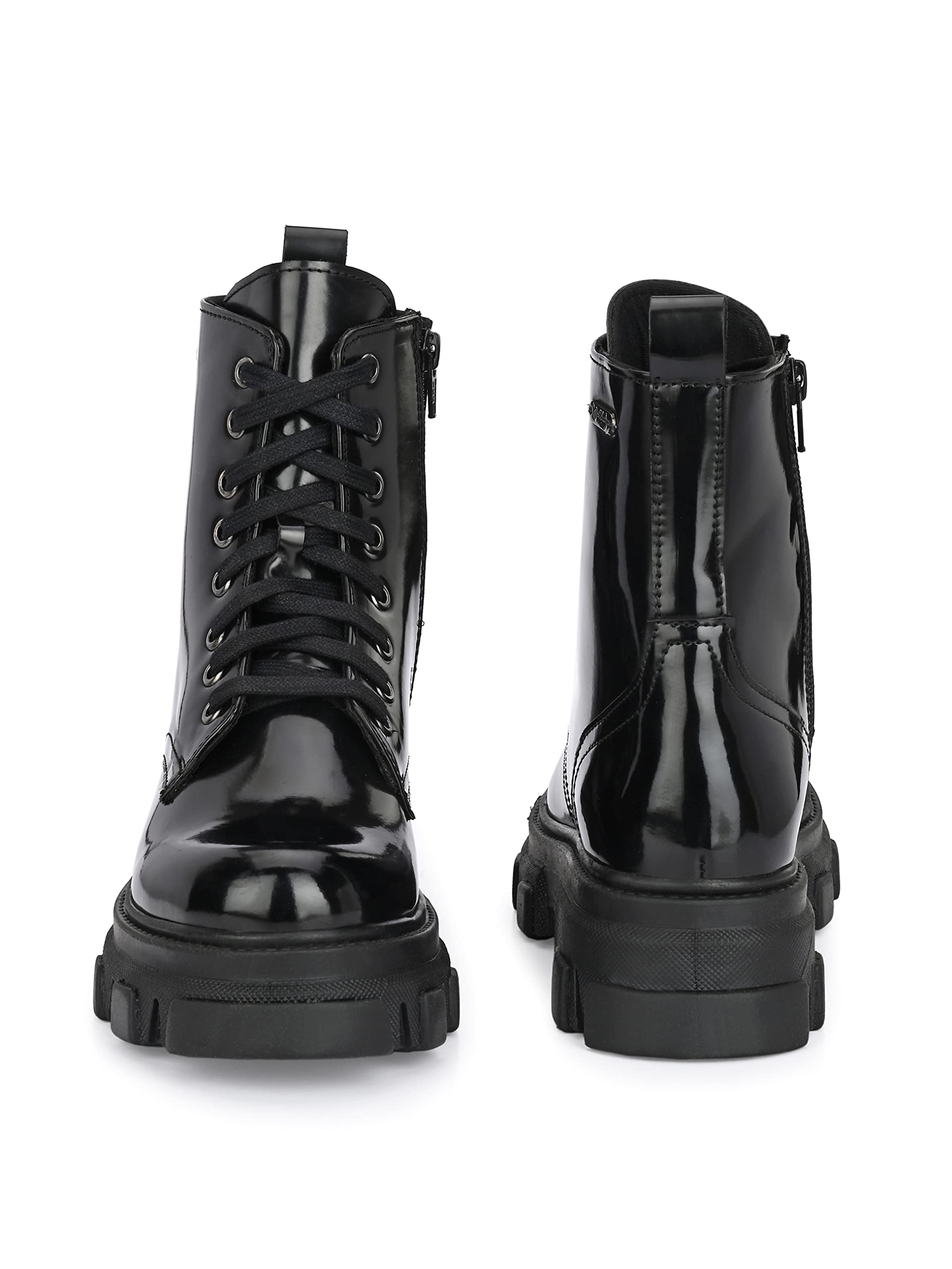 Black women vegan brush off leather women derby ankle boots with track outsole and back loop detail. Eight eyelets facing. Fabric lining and memory foam insock for ultimate comfort.