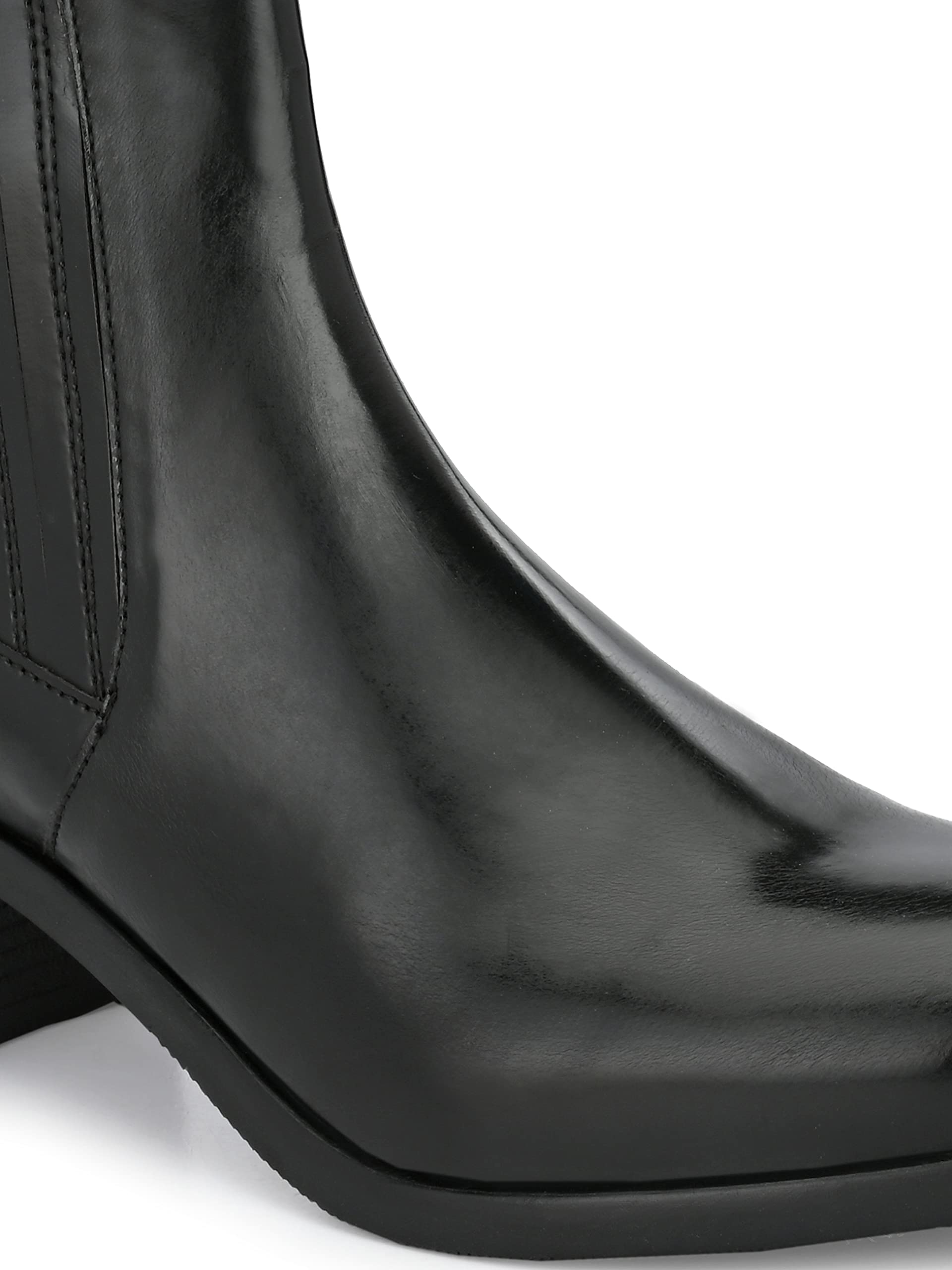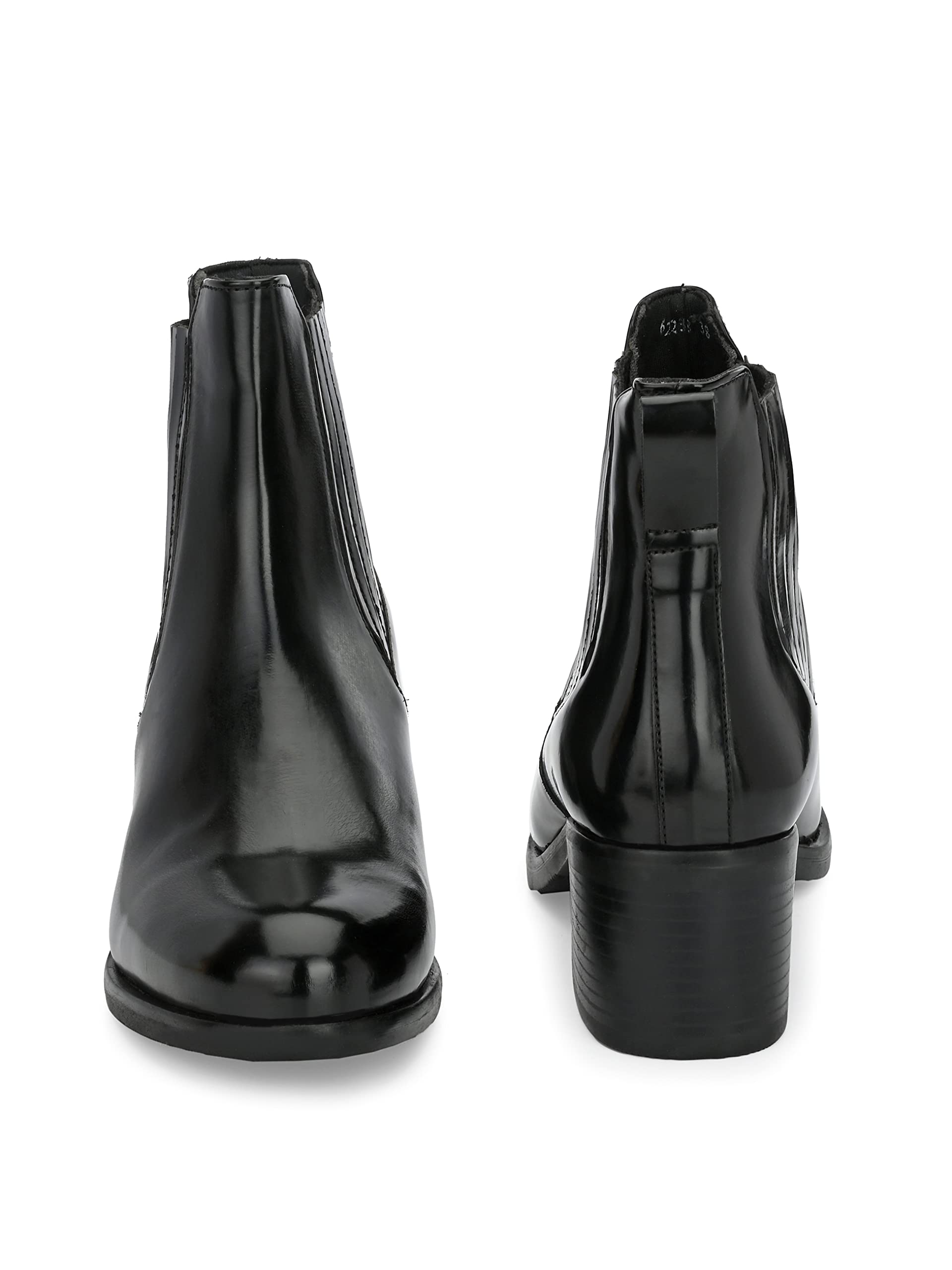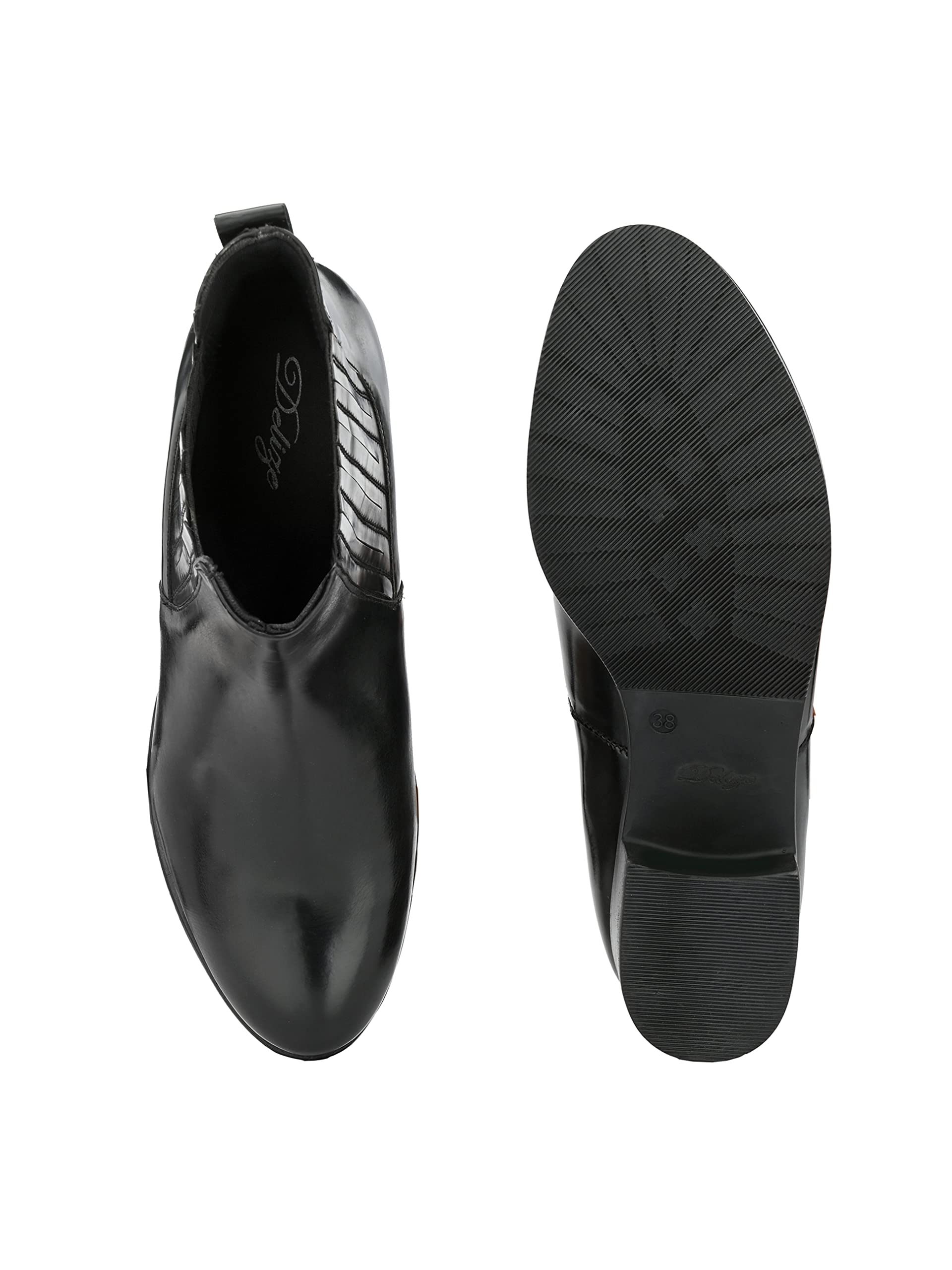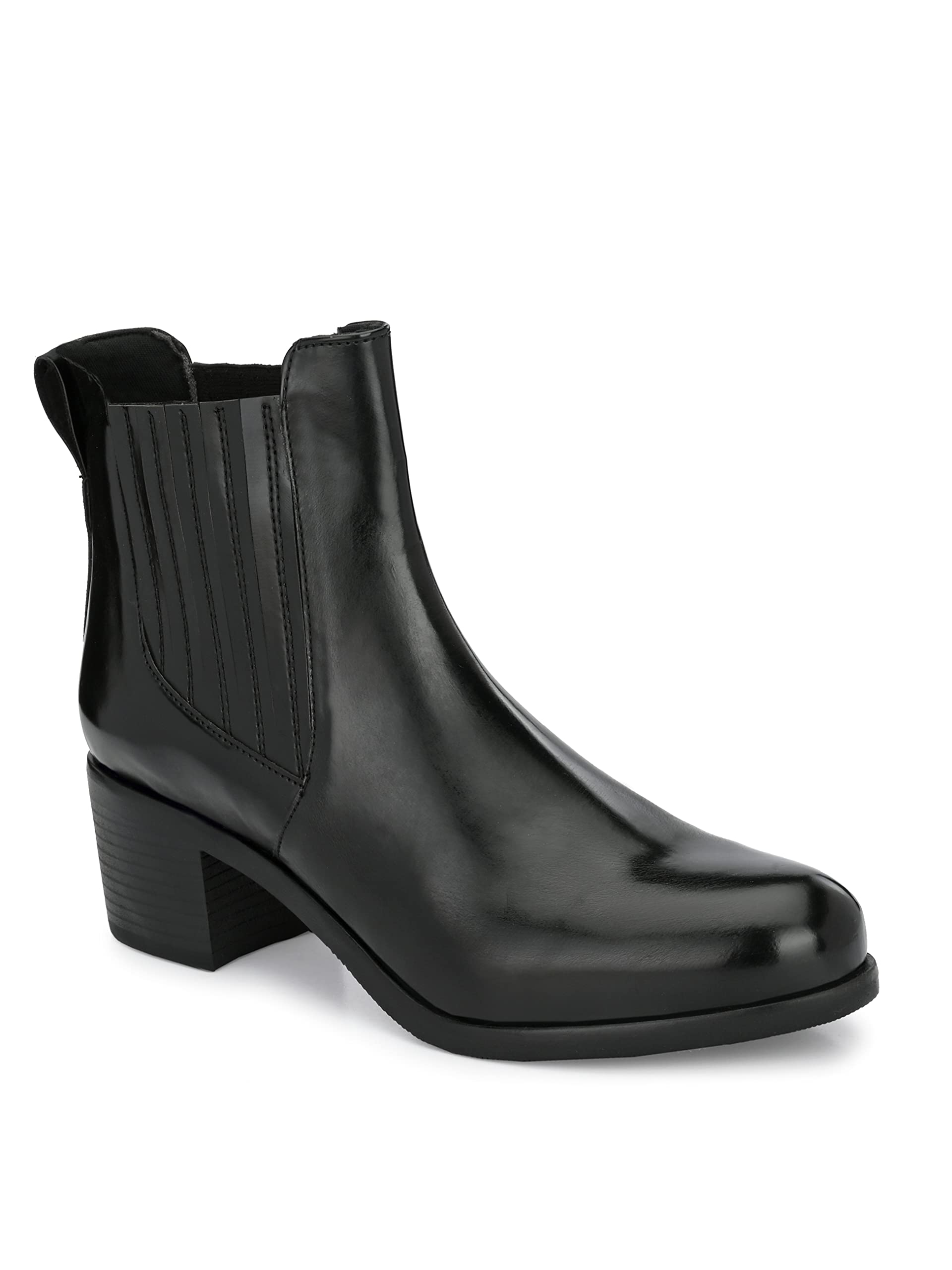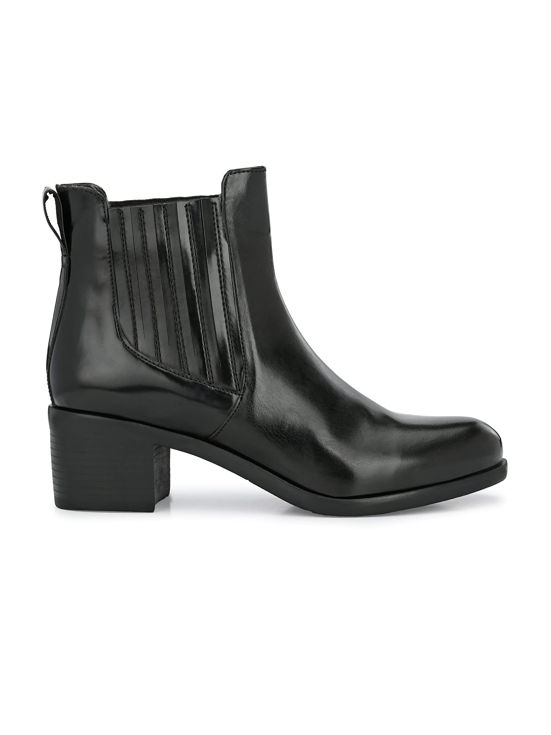 Black women vegan brush off leather chelsea ankle boots with elastic on both sides covered with leather strips. Has back loop detail. Fabric lining and memory foam insock for ultimate comfort.