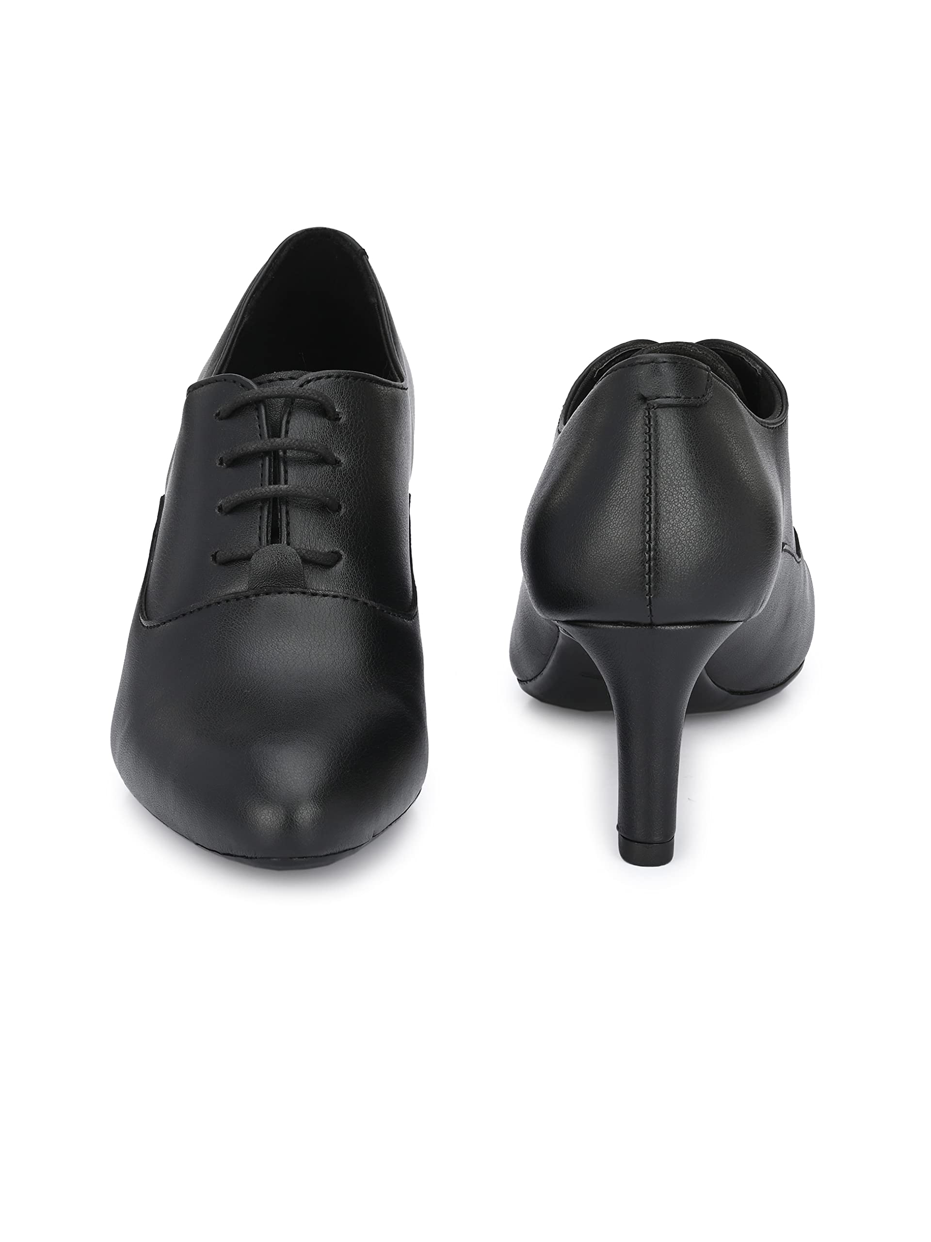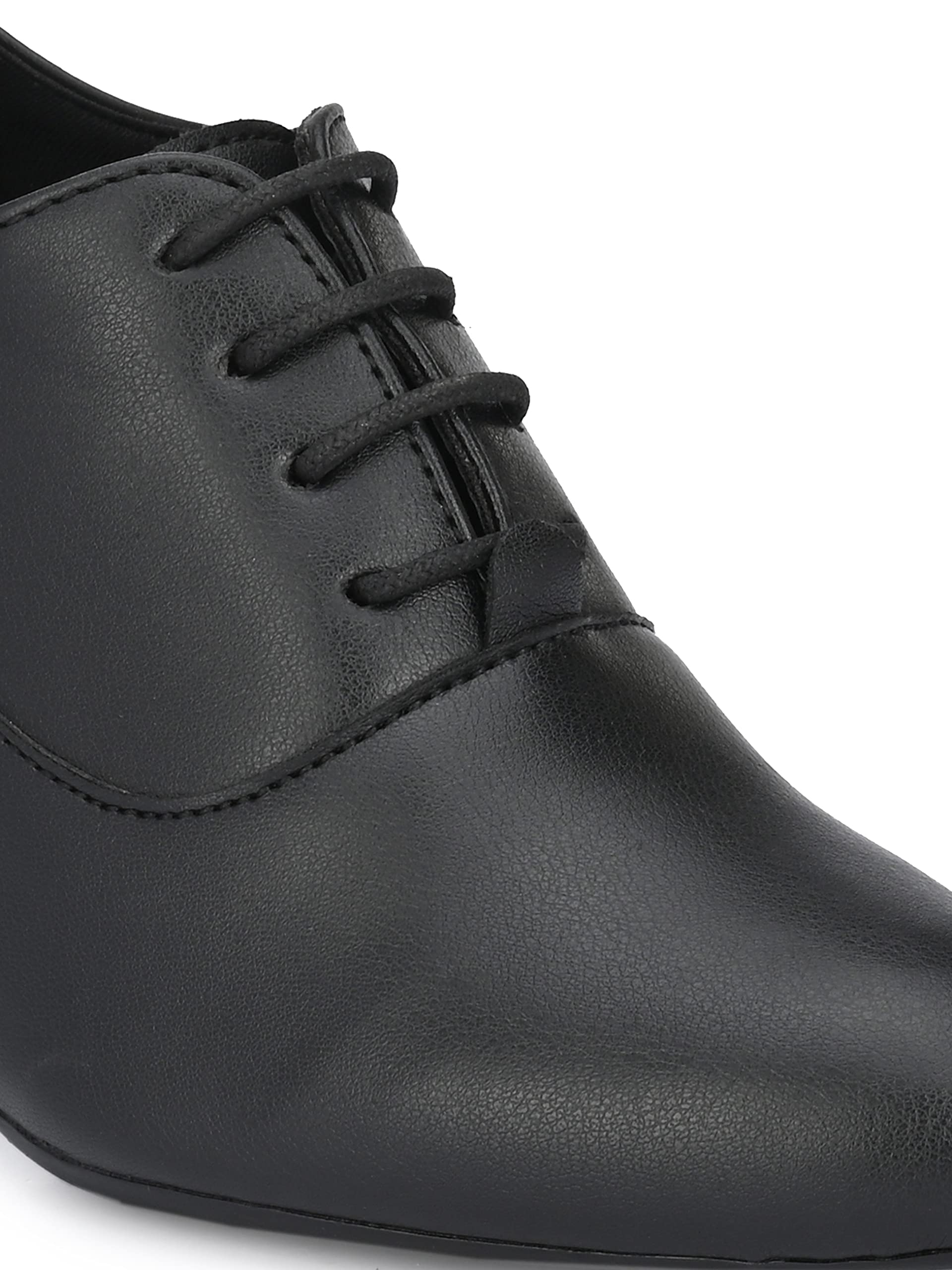 Black women vegan leather mid heeled derby shoes. Four blind ilet facing. Fabric lining and memory foam insock for ultimate comfort.