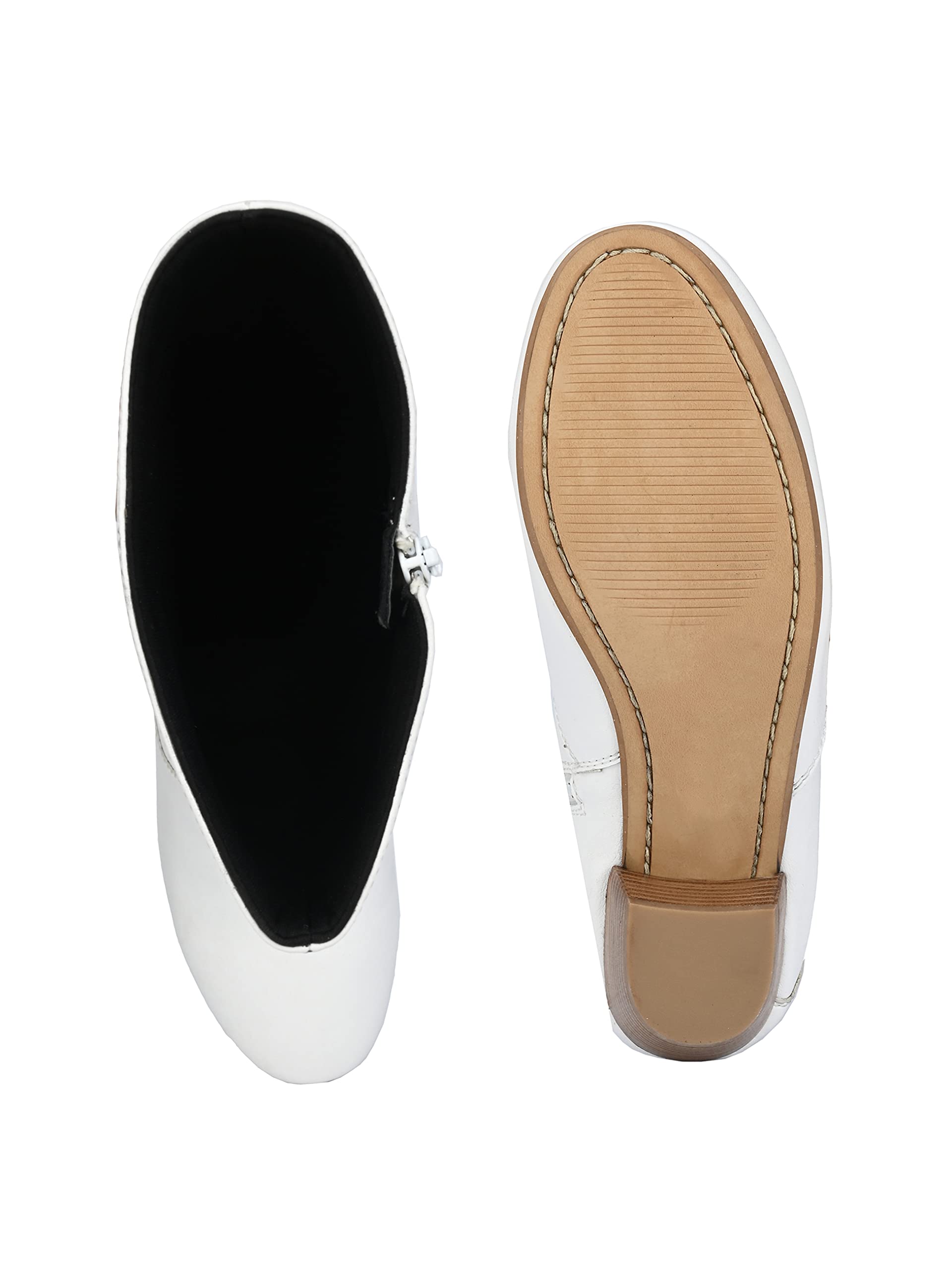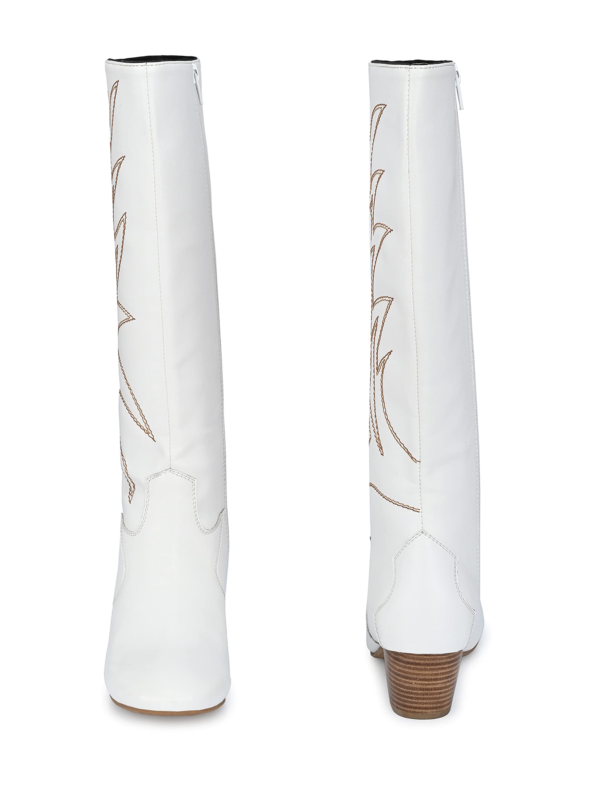 White women’s vegan leather, mid heeled knee high boots with beige stitching detail. Inside zip to wear easily. Fabric lining and memory foam insock for ultimate comfort.