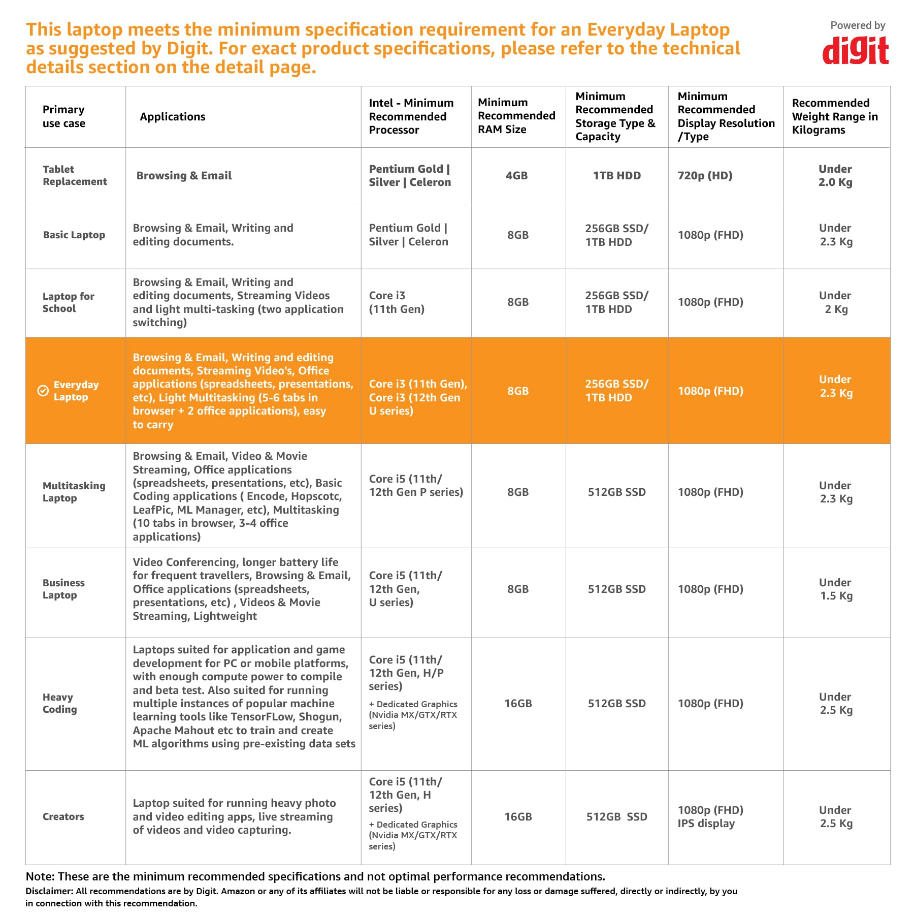 - Processor: Intel Core i3-1115G4 11th Generation (up to 4.10 GHz) 2 Cores, 6MB Cache // RAM & Storage: 8GB, 8Gx1, DDR4, 3200MHz_2666MHz Ach, (2 DIMM Slots, Expandable upto 16GB) & 512GB SSD