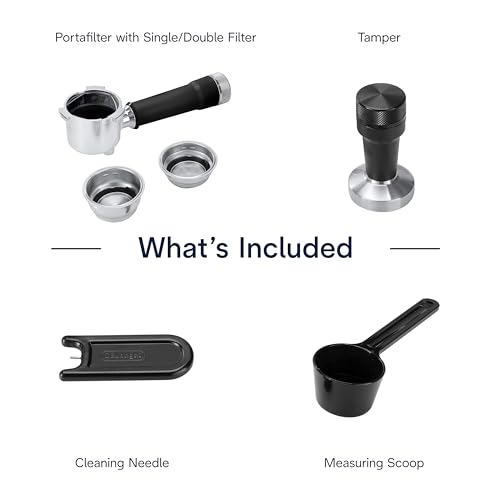 - Professional Barista Kit Included. Equip your countertop with everything you need to be your own barista: portafilter, professional tamper, measuring scoop and single and double filter baskets included.