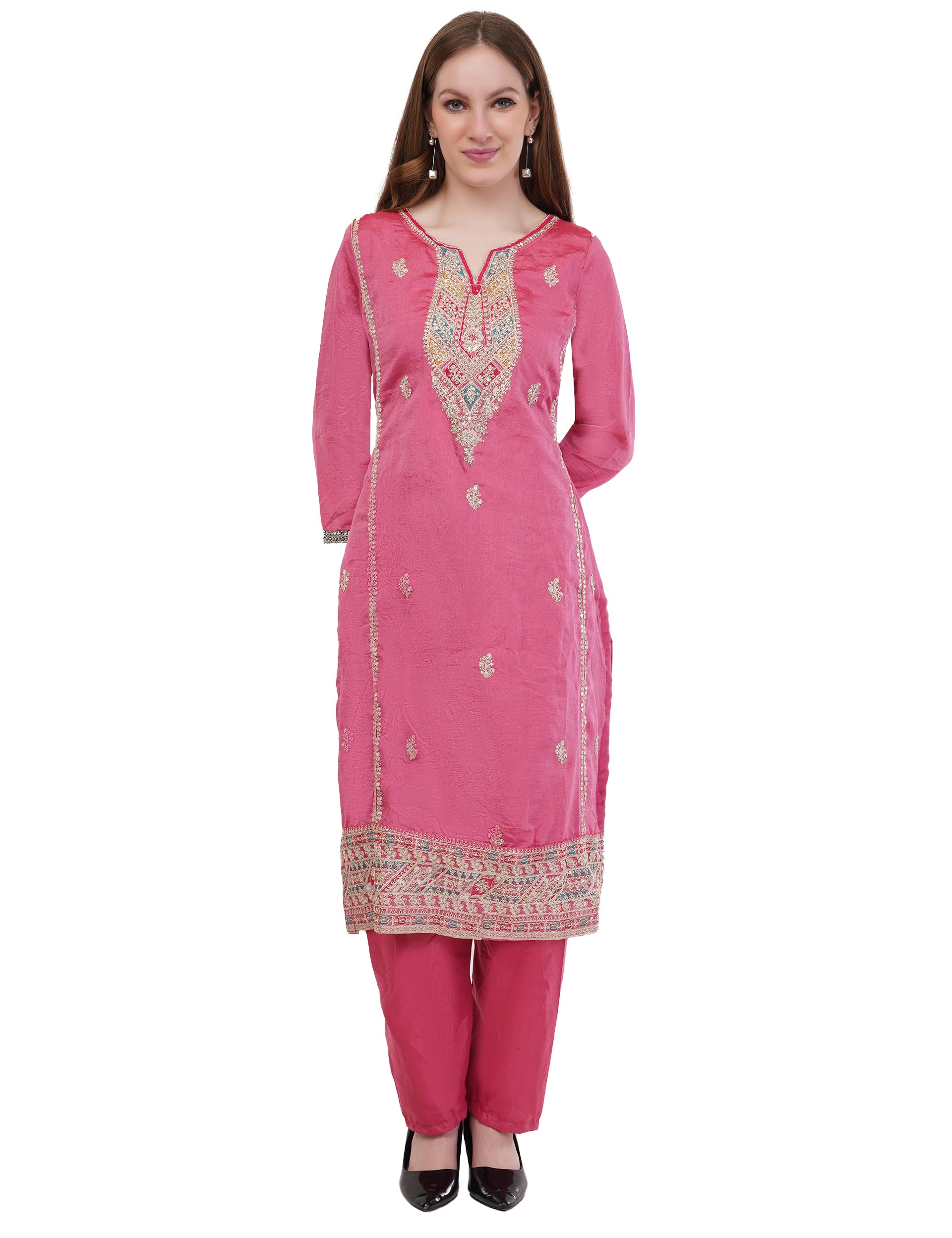 - Versatile Style: Featuring a modern V-neckline with intricate detailing, stylish 3/4 quarter sleeves, a rich Pink shade and a multi-colour dupatta, this woman's kurti set combines traditional elements with contemporary style, creating a versatile design that’s perfect for any occasion.