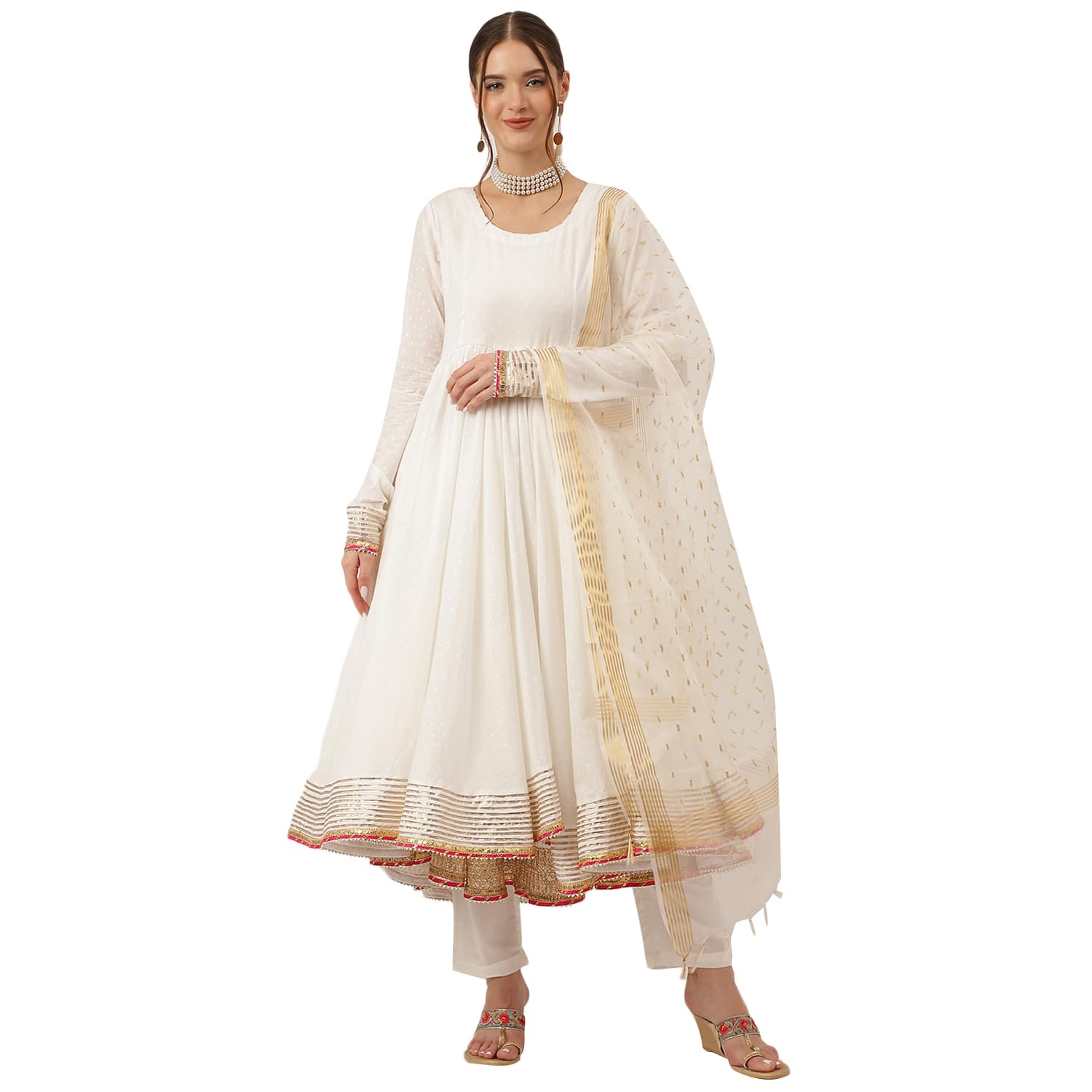 Divena Off White Shree Ram Buta Print Cotton Layered Anarkali Kurta, Trouser With Dupatta