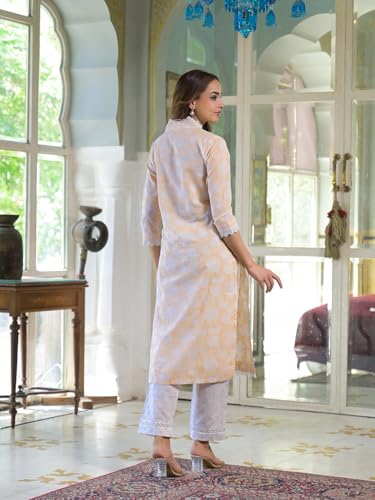 Divena Peach Block Print Cotton Straight Kurta Pant with Dupatta