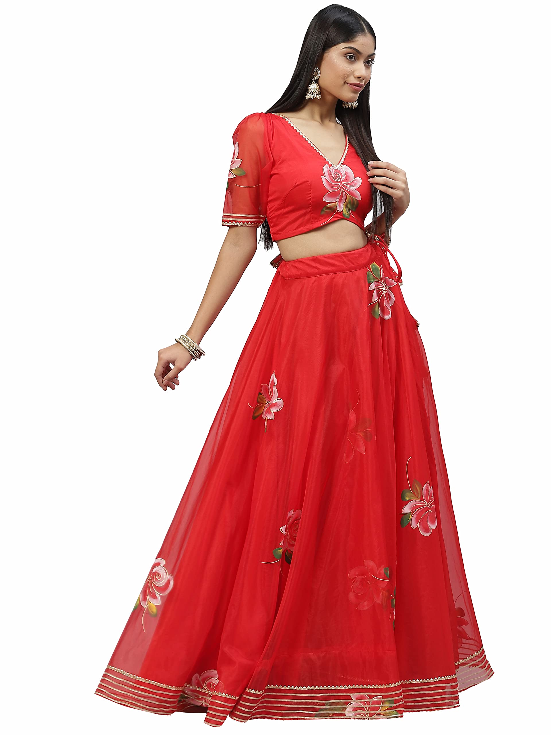 Divena Red Hand Painted Organza Flared Lehenga Choli Set with Organza Dupatta