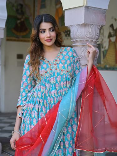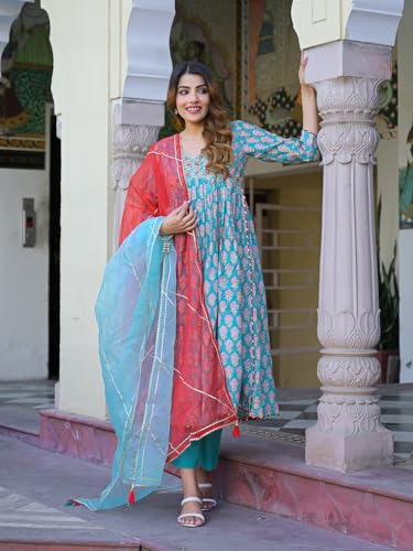 Divena Turquoise blue Floral Muslin Printed Kurta Pand with Dupatta