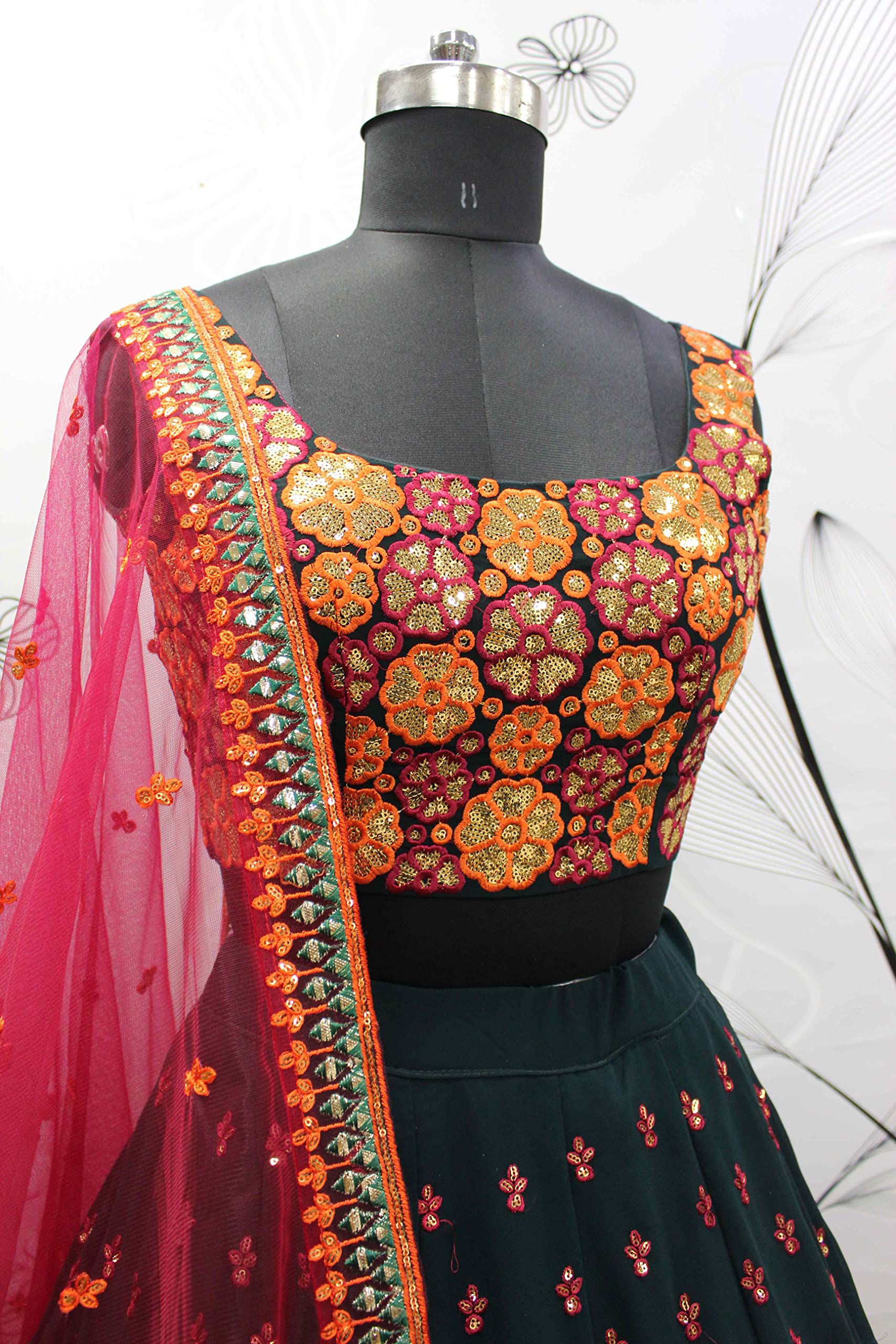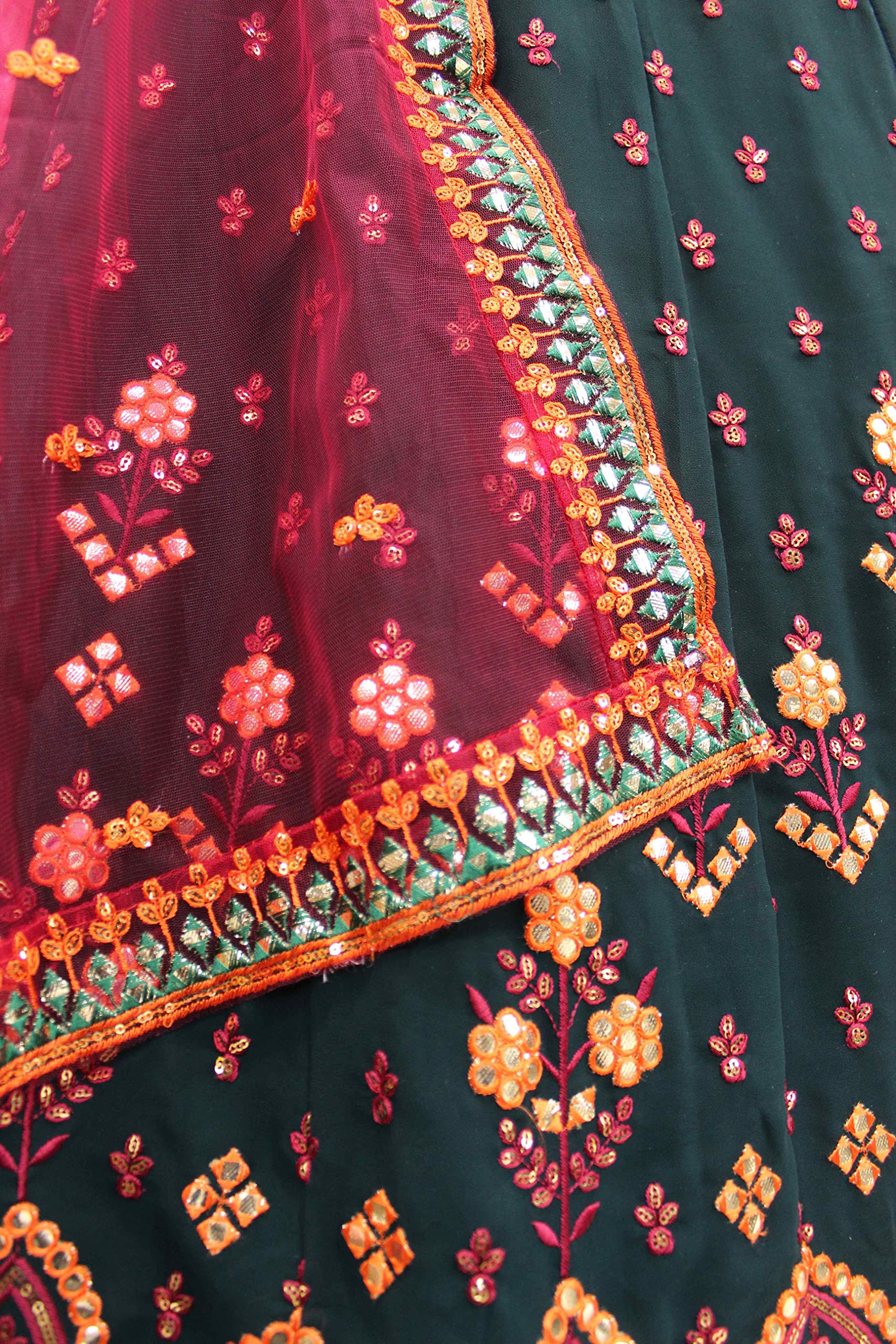- || Lehenga Color: GREEN || Choli Color: GREEN || Dupatta Color: DEEP PINK || Lehenga Fabric(Semi-Stitched): GEORGETTE || Choli Fabric(unstitched): GEORGETTE || Dupatta Fabric: NET