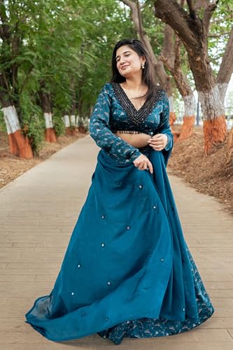 essaySumedha Agrawal Organza Satin Organza Santoon Floral Lehenga for Women (Size: XXL, Teal)
