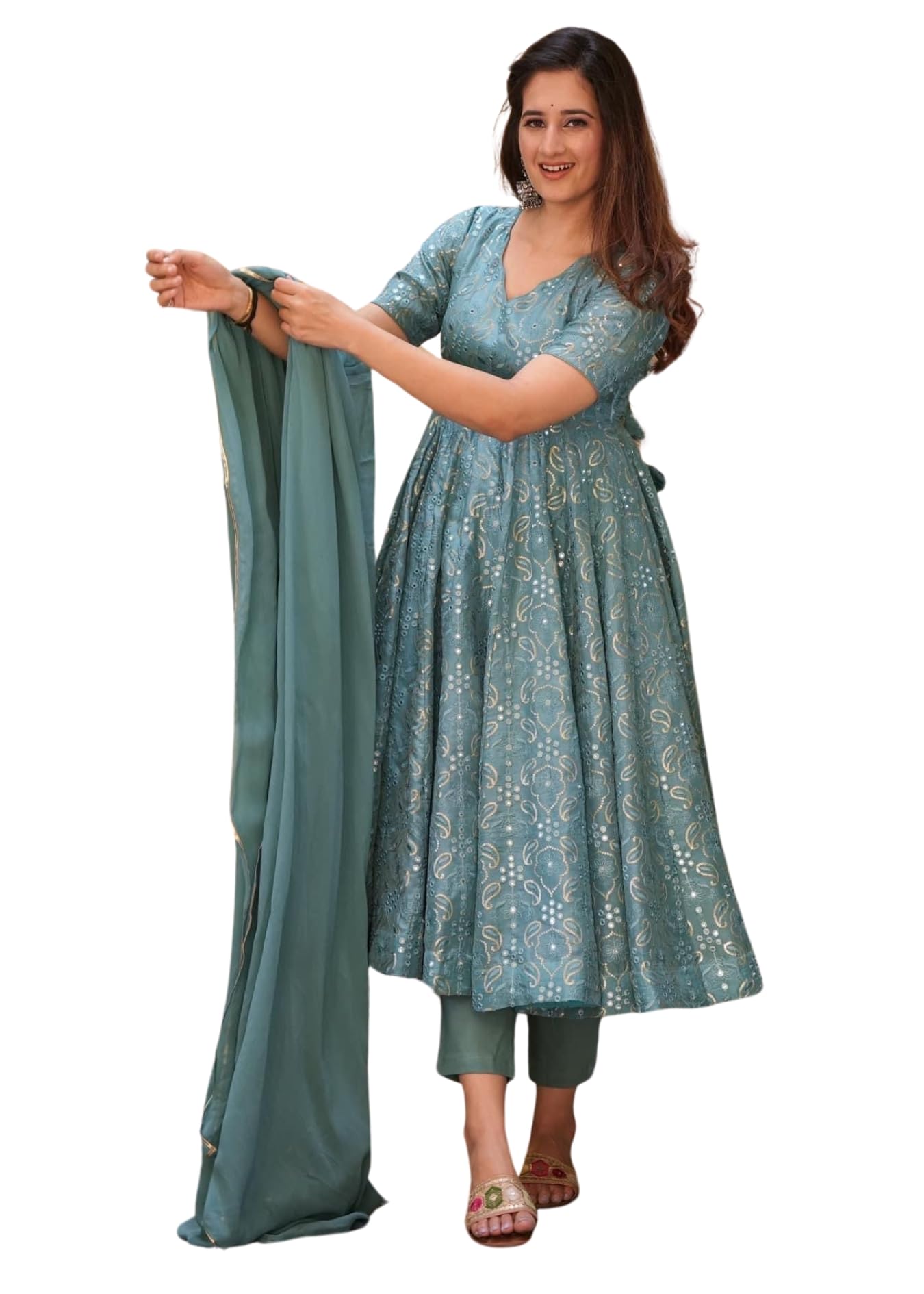 - Flattering Fit: The anarkali's flared skirt and fitted bodice create a feminine, figure-flattering silhouette.