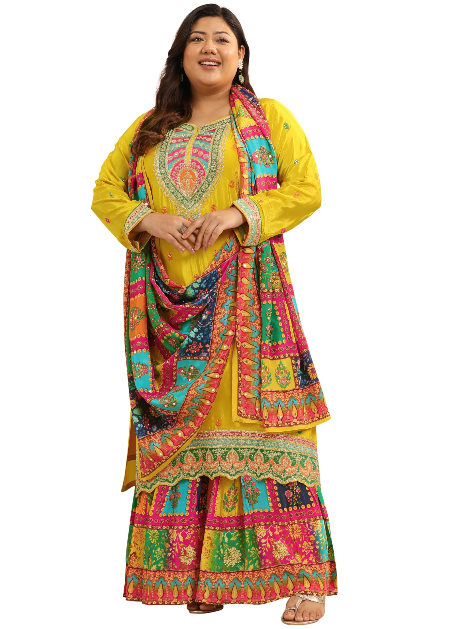 Woman Plus Size Mustard ethnic motif embroidered straight kurta with printed sharara with dupatta