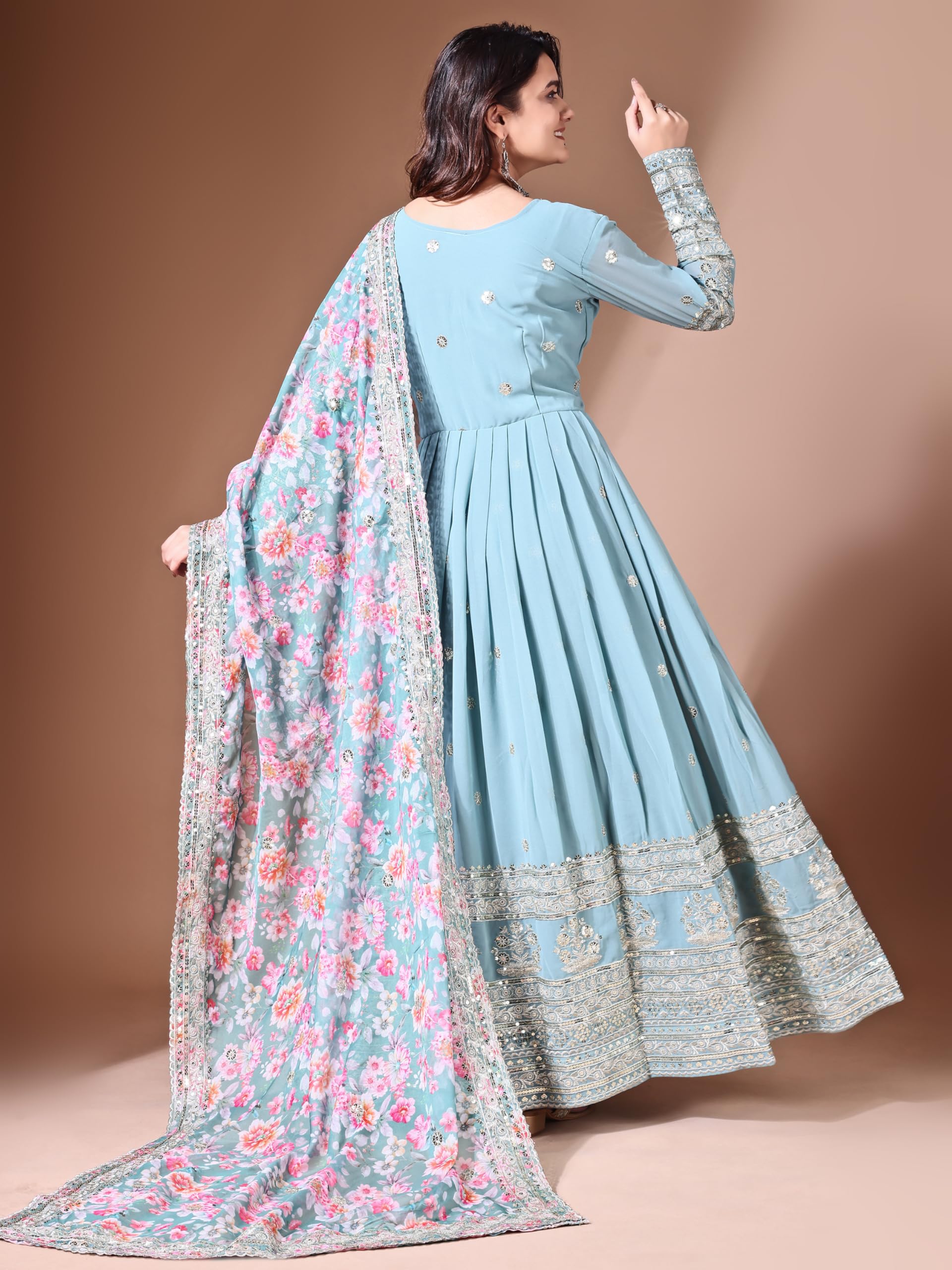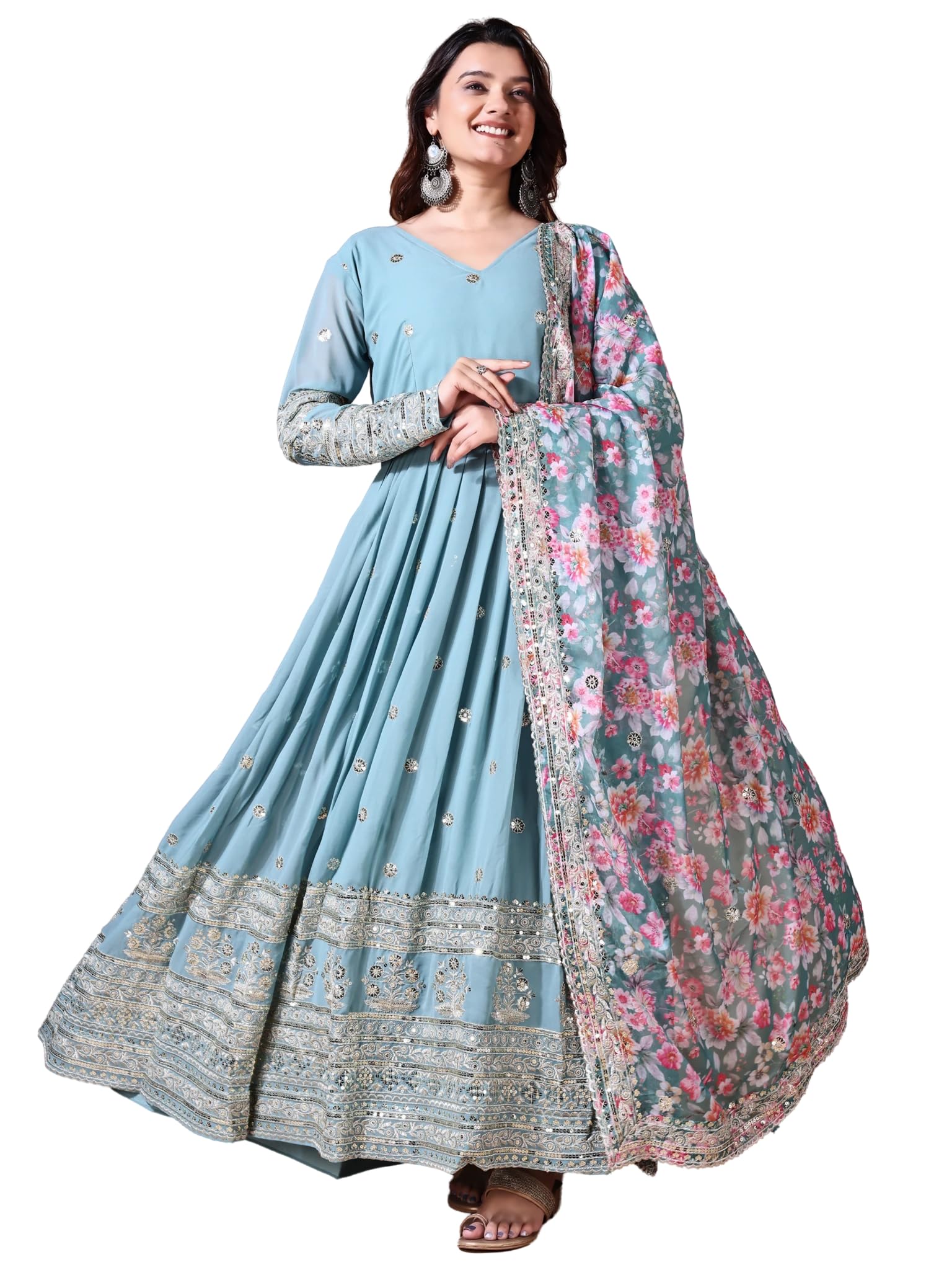 Fashion Basket Georgette Embroidered Anarkali Dress for Women (in, Alpha, 2XL, Regular, Sky Blue)