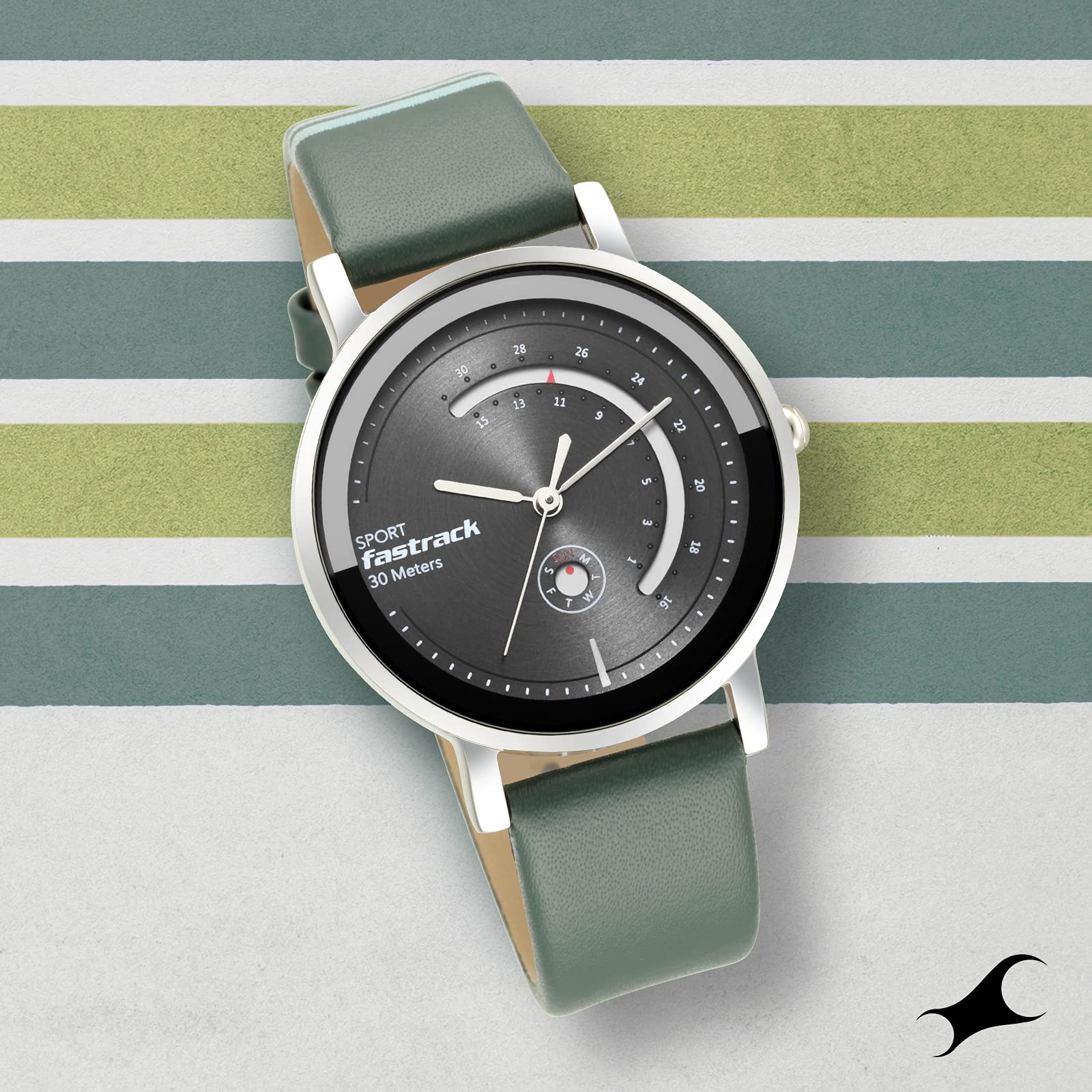 A trendy green watch designed for a very quirky look. Wear this beautiful watch with your floral maxi dress to get that perfect summer look. Case dimension: 37.00x44.00x7.53 mm 3 ATM/30 m Water resistance. Leather Strap. Stainless steel back cover. High precision quartz analogue movement. 2 years warranty period