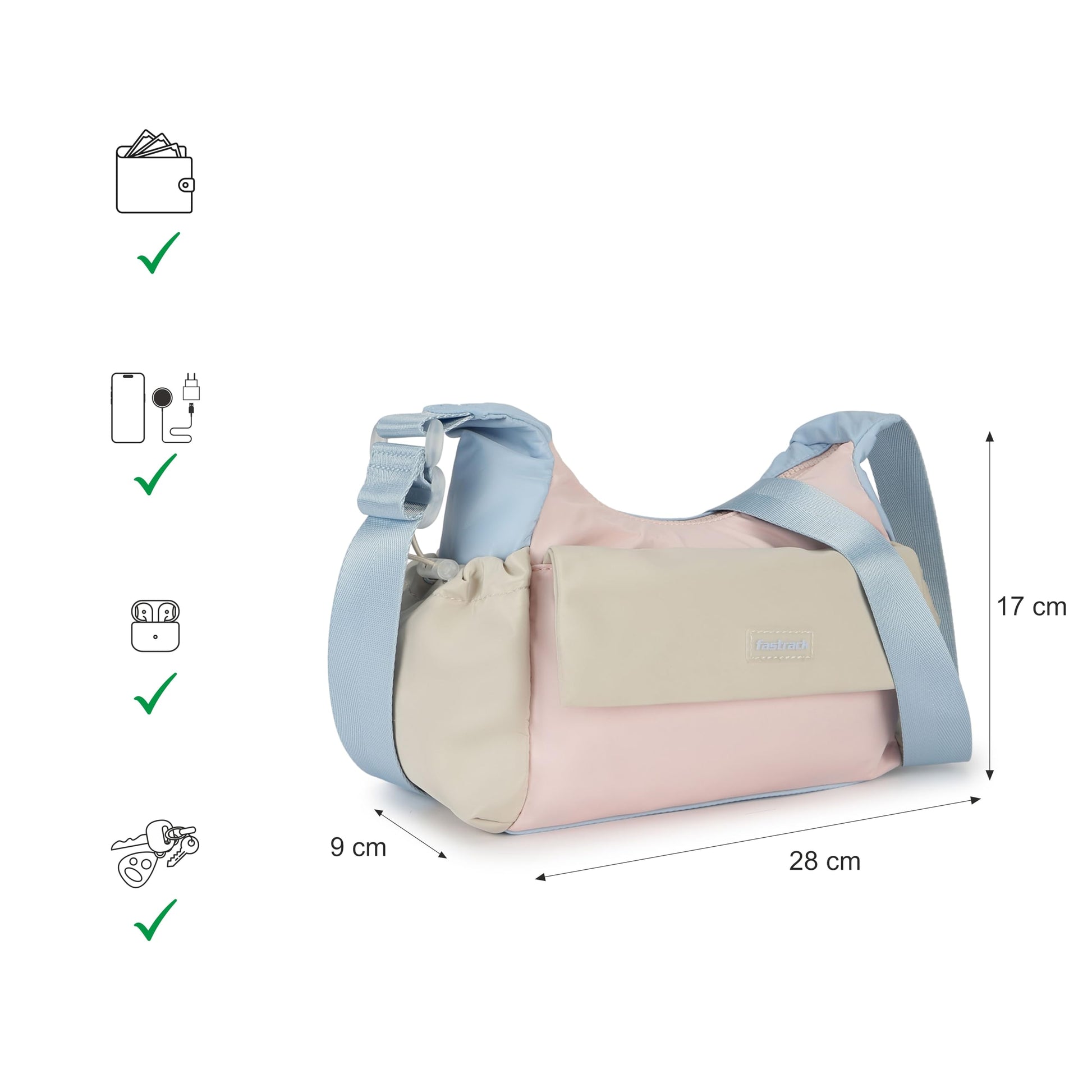 Lightweight but loaded with function — meet the Fastrack Cloud Pop Sling, your go-everywhere essential designed to keep up with the city pace. Made from sleek, durable nylon, this sling bag is built to be your everyday sidekick, balancing minimal style with practical utility. The wide tonal webbing strap sits comfortably on your shoulder, while silver-tone hardware adds a subtle, modern twist for a look that’s effortlessly urban. Inside, the roomy main compartment offers enough space for your phone, wallet, and daily must-haves, while two internal utility pockets help keep smaller essentials organised and easy to reach. A secure zipper pocket keeps valuables safe, and a front quick-access section makes sure your metro card, keys, or earbuds are always right at hand — perfect for busy days on the move. Lightweight yet sturdy, the Cloud Pop Sling is made to carry just what you need without weighing you down. Whether you’re hopping metros, exploring the city, or heading out for a laid-back stroll, this bag keeps your essentials streamlined and close. To keep it looking fresh, wipe clean with a dry or slightly damp cloth. Backed by Fastrack’s 6-month warranty for daily peace of mind.