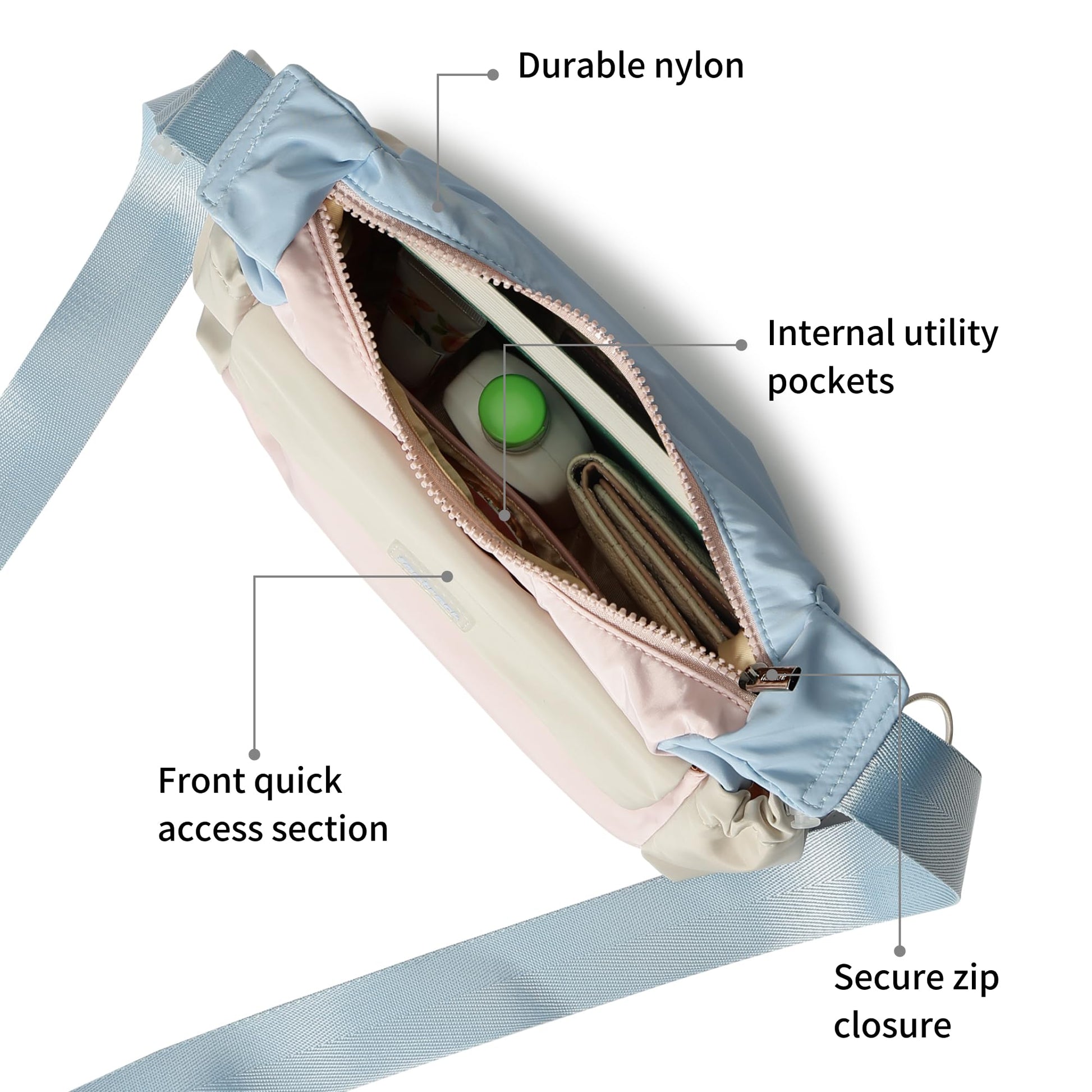 - Lightweight nylon sling bag designed for everyday movement, balancing sleek style with city-ready function.