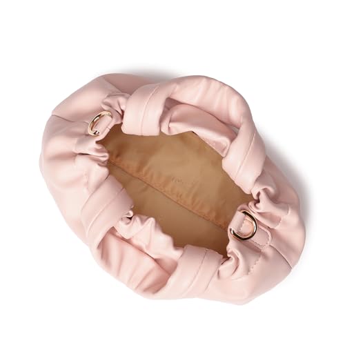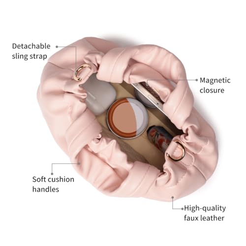 - Soft pink sling bag with a ruched texture and structured silhouette that combines minimal style with a touch of playful charm.