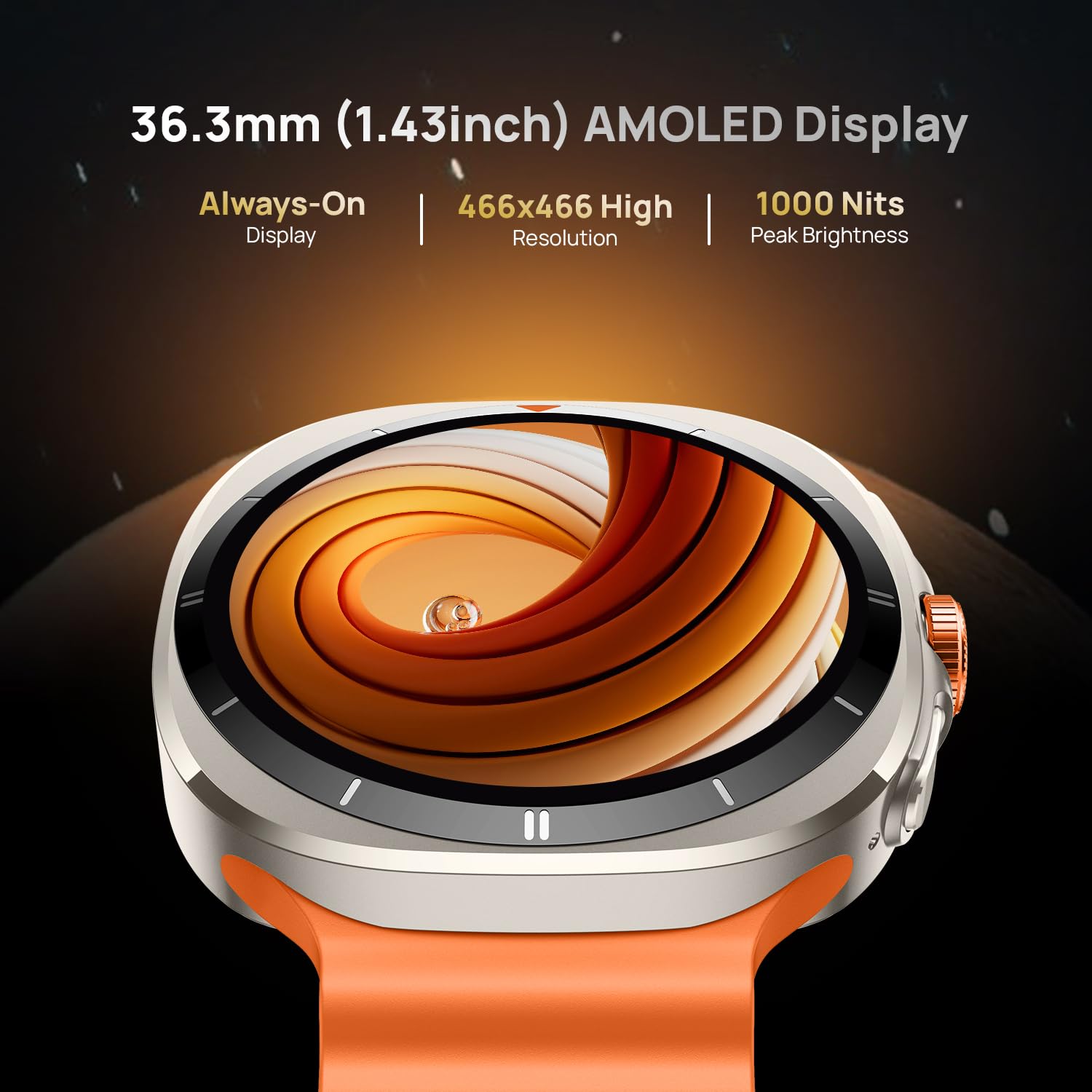 - VIBRANT AMOLED DISPLAY WITH ALWAYS-ON MODE: Experience stunning clarity with a 1.43" AMOLED display featuring a sharp 466×466 resolution and up to 1000 nits brightness. Enjoy vivid visuals with smart watch for men even in direct sunlight, with Always-On Display keeping key info visible at a glance.