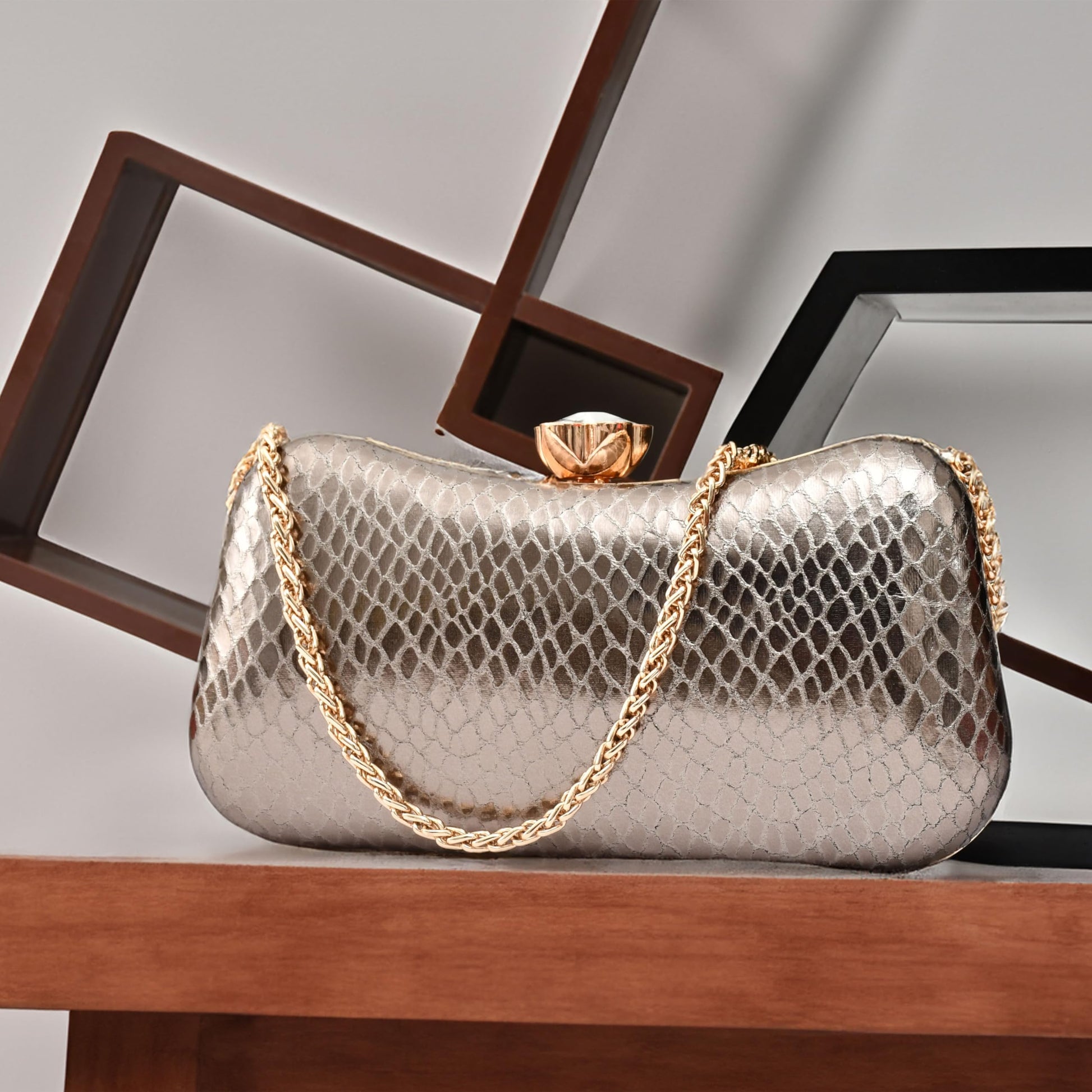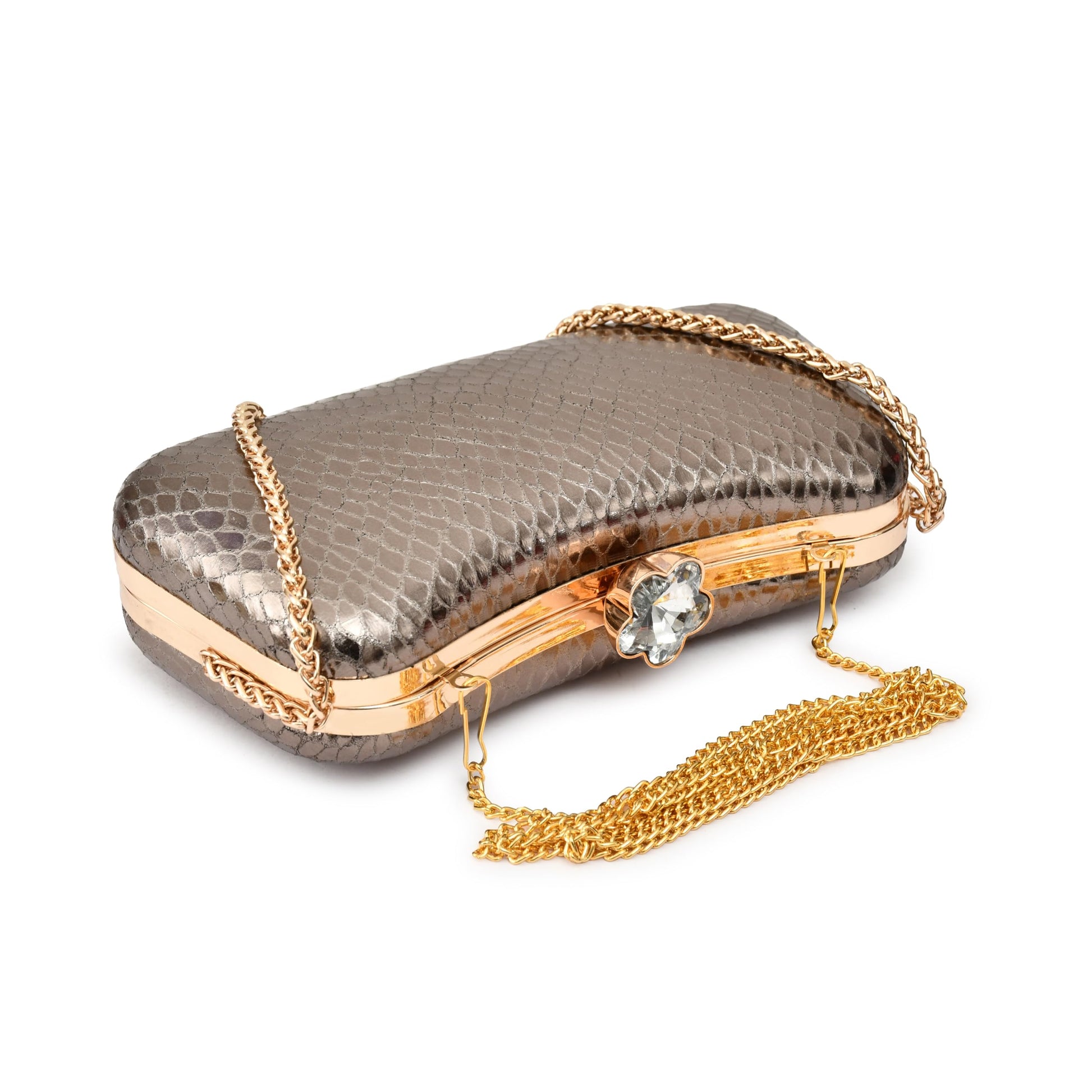A stylish and elegant clutch from the house of QHAN Handicraft for women, outer material is made of synthetic and inner material is made of metal with clasp closure type and it has metallic handle and detachable chain strap. You can pair it with your ethnic and casual wear. Do not expose overheat and do not wash.