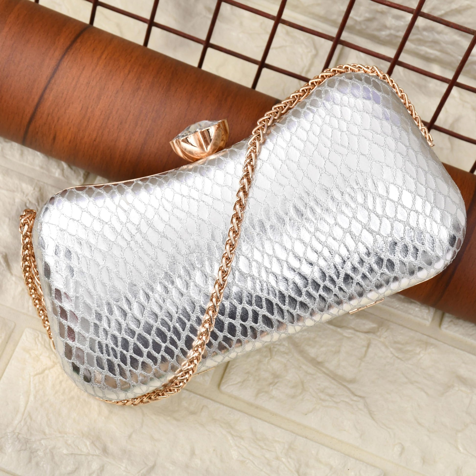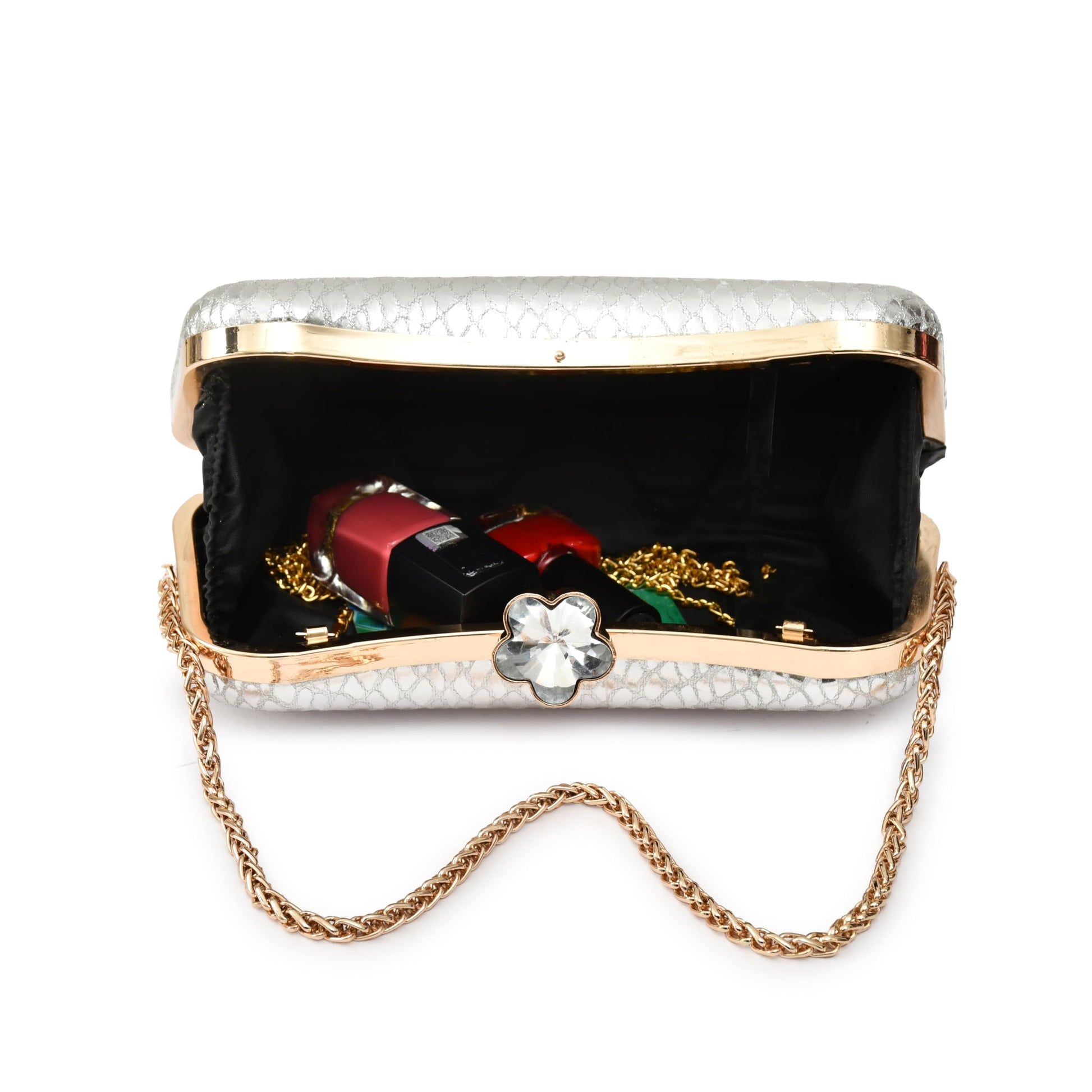 A stylish and elegant clutch from the house of QHAN Handicraft for women, outer material is made of synthetic and inner material is made of metal with clasp closure type and it has metallic handle and detachable chain strap. You can pair it with your ethnic and casual wear. Do not expose overheat and do not wash.