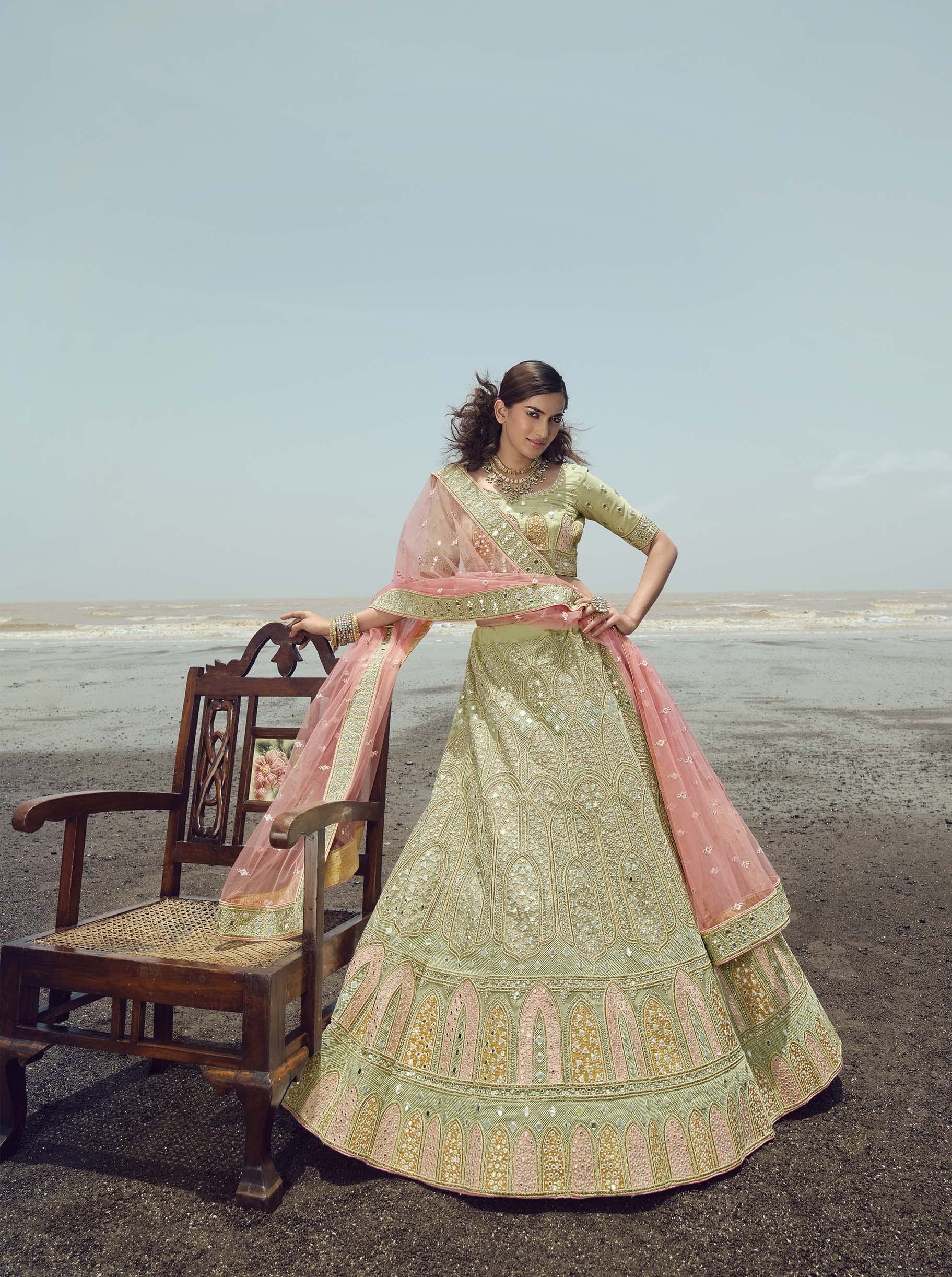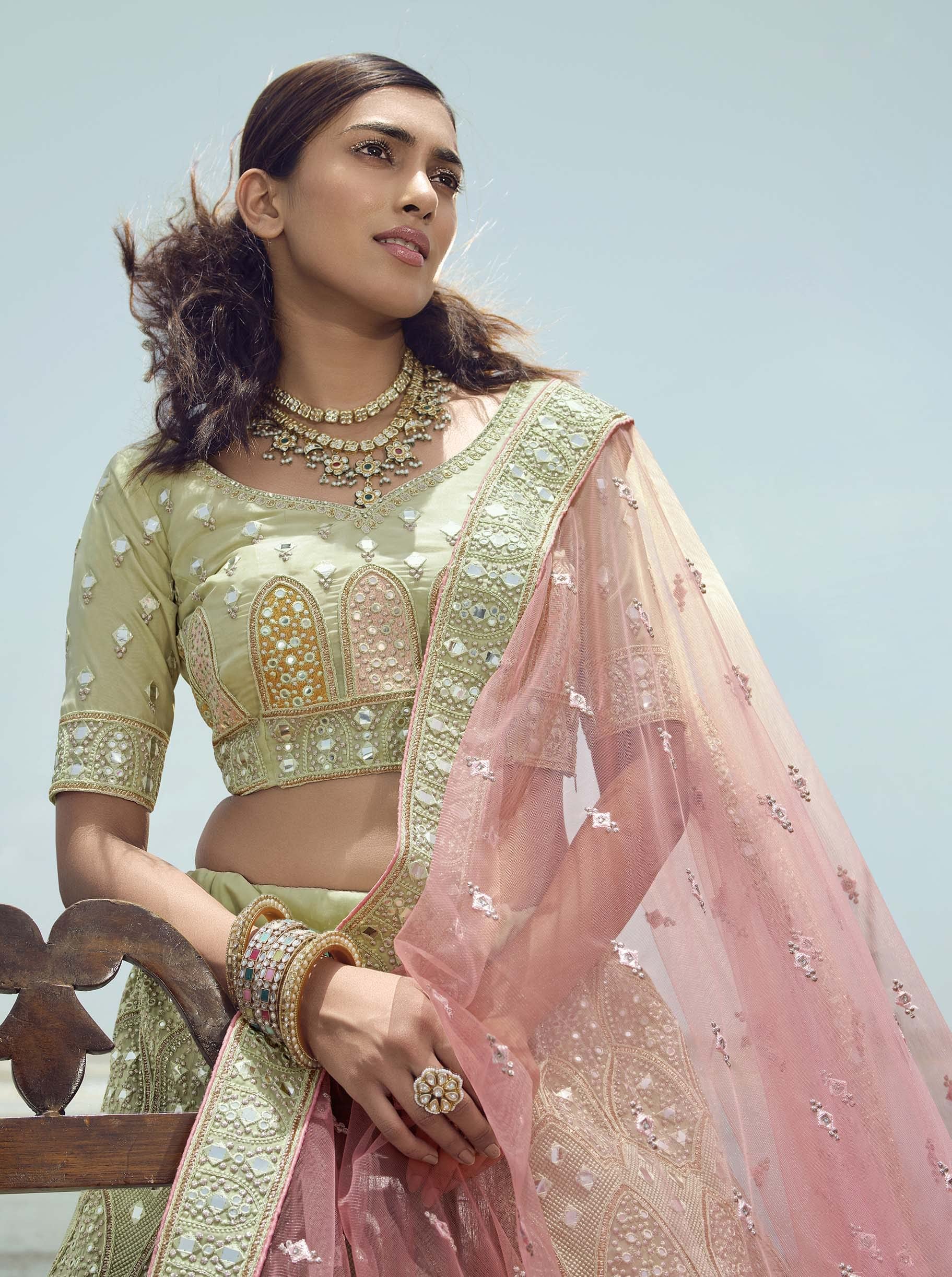 FUSIONIC Admirable Pista Green Stone Work organza base Base Lehenga Choli For Women
