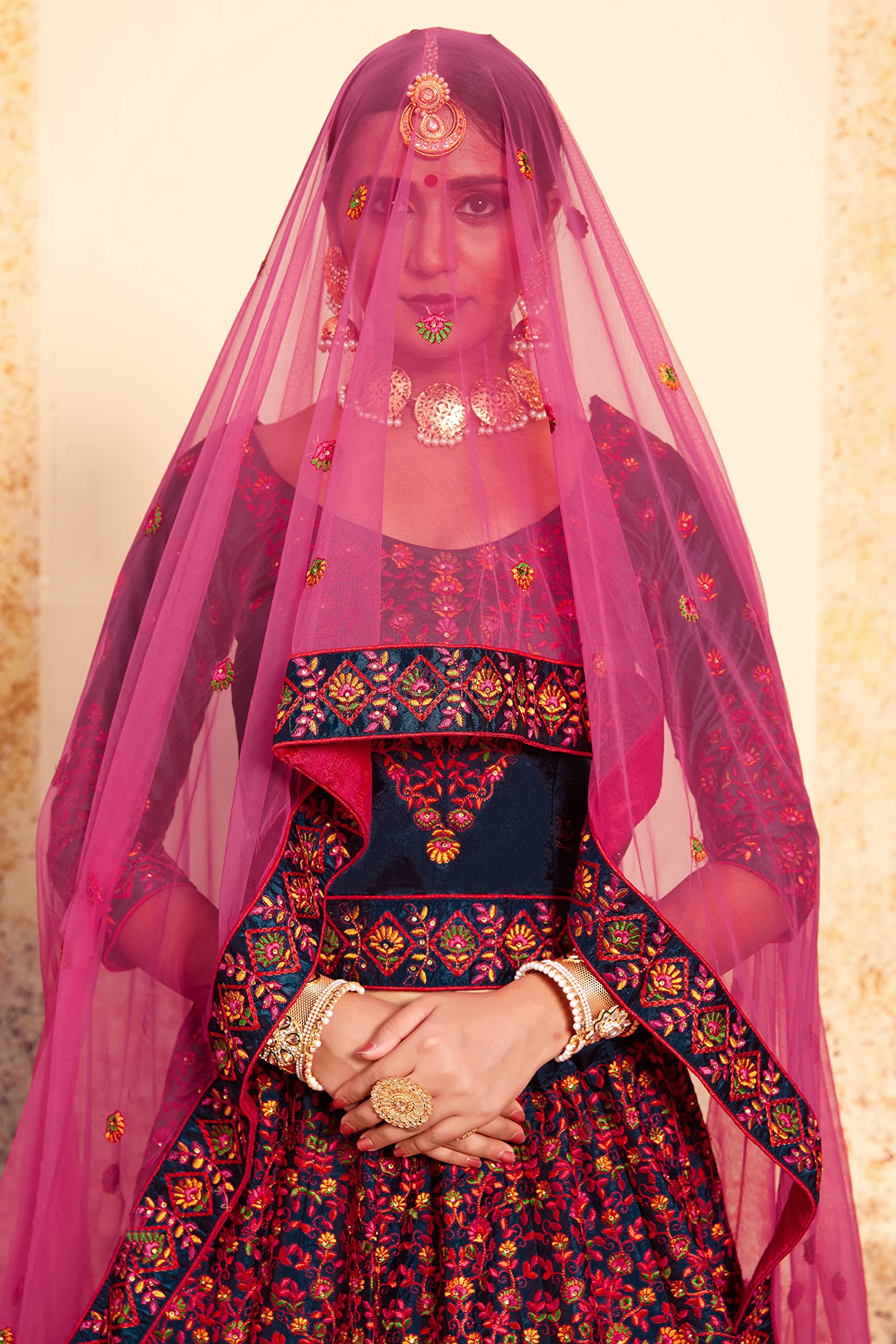 Choose this bridal lehenga as your ceremonial and party wear choice for a wedding reception and look sumptuous. This Bollywood lehenga is made of soft net and georgette and features lace with heavy work in zari, stone, beads, and sequins. The flared lehenga comes in a rich traditional shade of maroon teamed with deep navy blue.