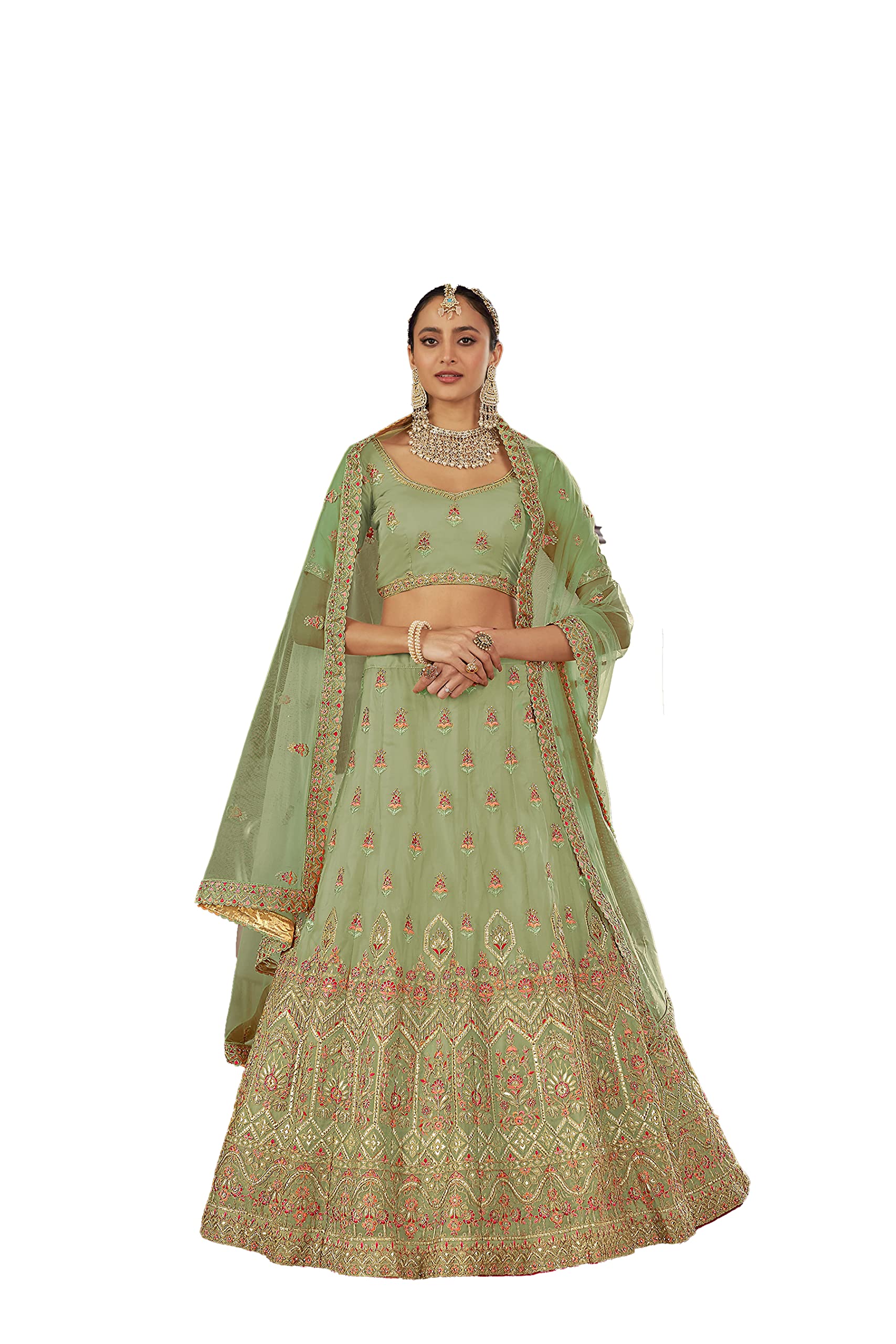 FUSIONIC Pista Color Zarkan And Thread Work Organza Base Lehenga Choli For Women
