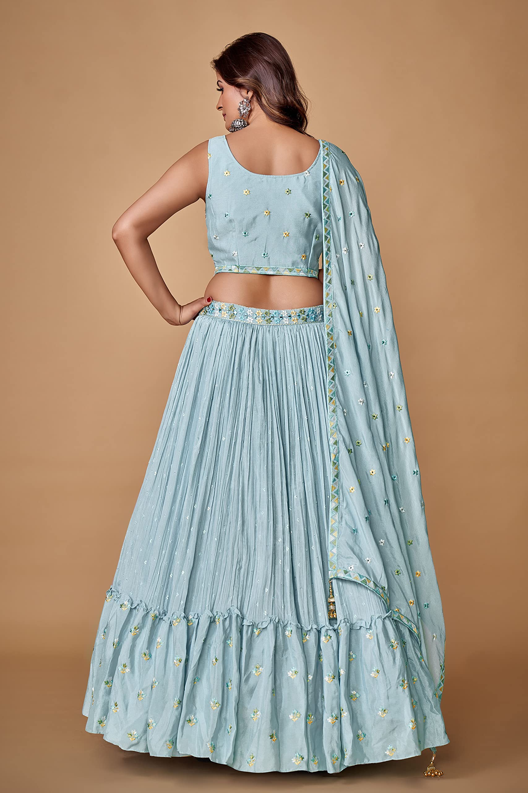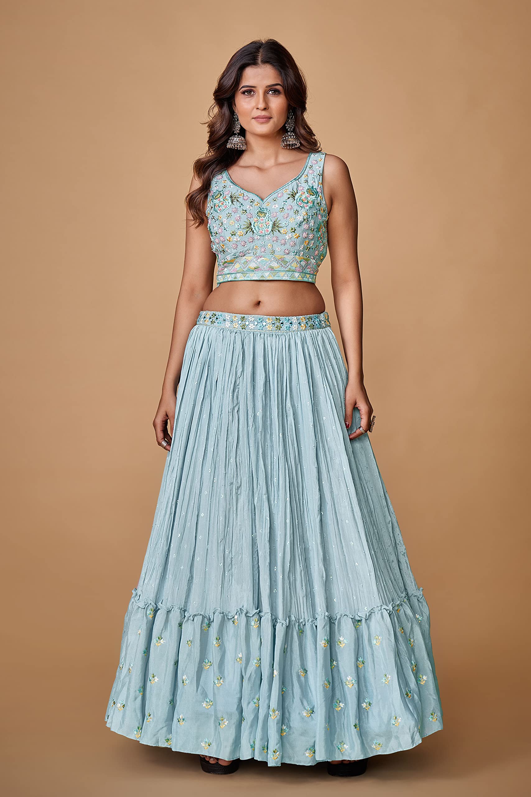 FUSIONIC Sequins With Pearl Powder Blue Ruffle Lehenga