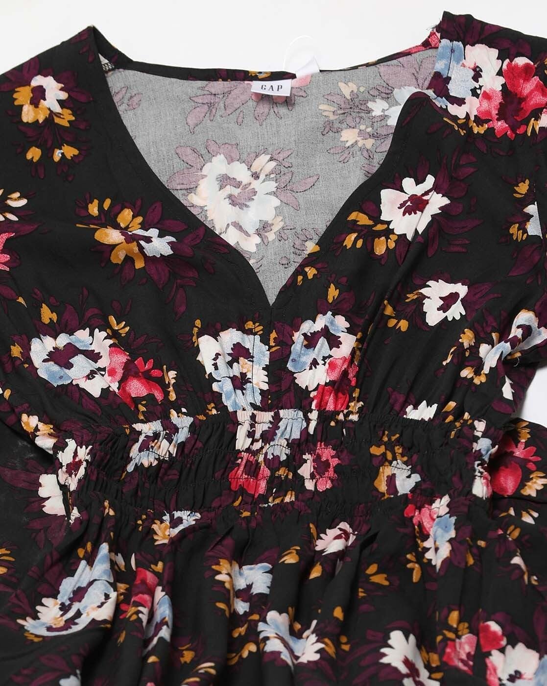 Gap champions a uniquely optimistic sense of American style that bridges the gaps between individuals, generations, and cultures. This floral dress is designed for casual occasions, featuring a regular fit, v-neckline, and full sleeves. The slit detail adds a chic touch, while the soft, breathable fabric ensures comfort for all-day wear. MACHINE WASHABLE: Easy to care for, this product can be washed with like colors on the gentle cycle.