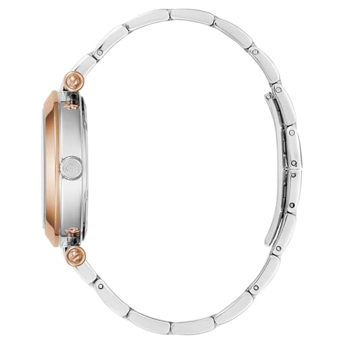 - This 36.5 mm watch features a reliable Swiss movement encased in a polished silver and rose gold PVD case, paired with a sleek silver bracelet for a refined look.