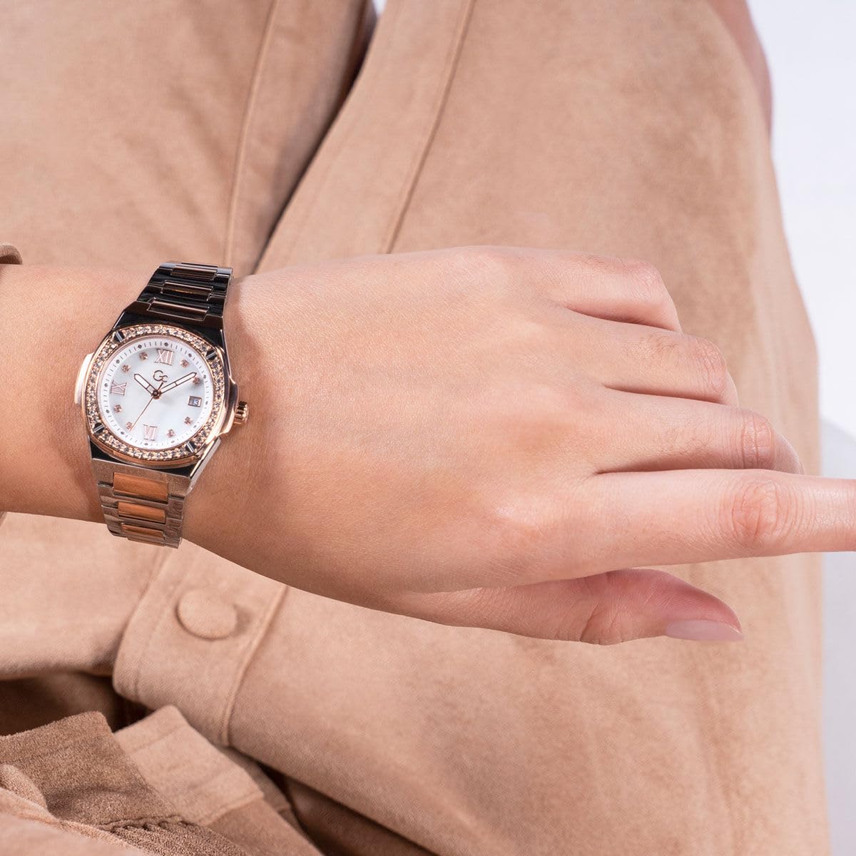 Add a perfect finishing touch to your look with this women analog watch from Gc. The mother of pearl round dial is protected by a mineral glass. The stainless steel strap comes in a silver and rose gold hue that further elevates the look of the timekeeper. Besides, it is completed with a folding clasp to ensure a secure fit on the wrist.