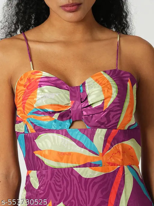 NameGlobus Women Purple Floral Print Neck Strappy Shoulder Cut-Out Detail Midi Bodycon Party Dress
